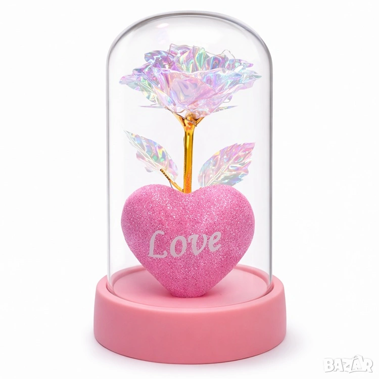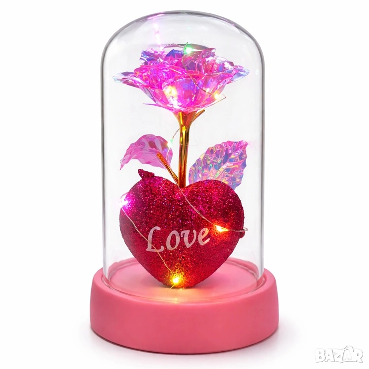 Елегантна роза, изработена от фино метално фолио, поставена под прозрачен купол с разноцветни LED светлини. Допълнена с блестящо сърце с надпис LOVE, тя създава нежна и романтична атмосфера, която впечатлява от първия поглед.