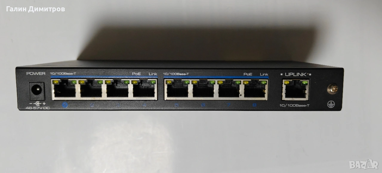 10 портов POE суич (8 POE порта и 2 uplink). Проверен е и работещ. Със 120W захранване към него.