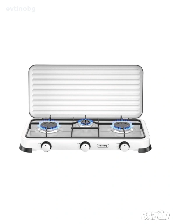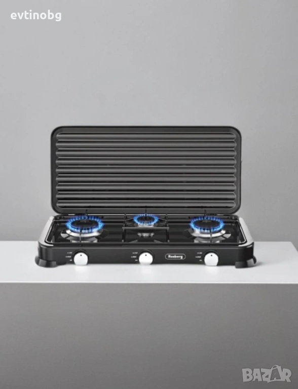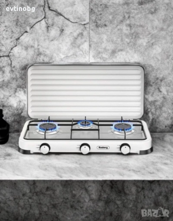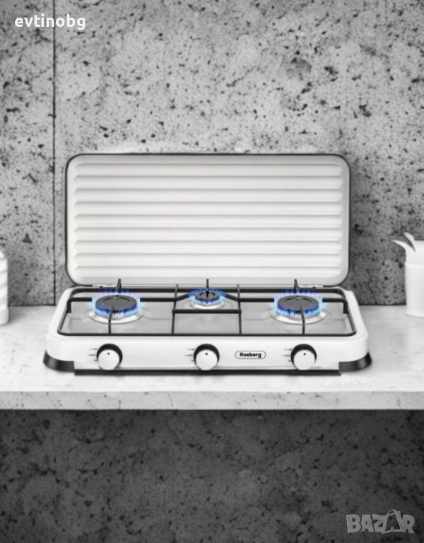 Горелка от лят алуминий с емайлирана капачка. Метална скара за тиган. По-добър пламък и по-бързо готвене. Икономичен и мощен. Висококачесвен, безопасен и лесен за използване. Мощност: 2 х 2.2 kWh+ 1 x 1 kWh. Тип газ: Бутан, Пропан и техните смеси. Налягане: 30 mbar.