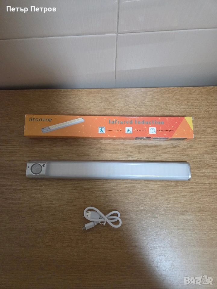 DFGOTOP инфрачервена индукционна LED лампа със сензор за движение. Функции: Автоматично включване при движение и изключване след напускане на зоната. Употреба: Подходяща за осветление в гардероби, шкафове или коридори. Захранване: Презареждаема чрез включения USB кабел.