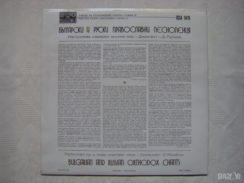 Грамофонна плоча - ВХА 1419 - Български и руски православни песнопения. Изпълнява камерен мъжки хор, диригент Димитър Русков