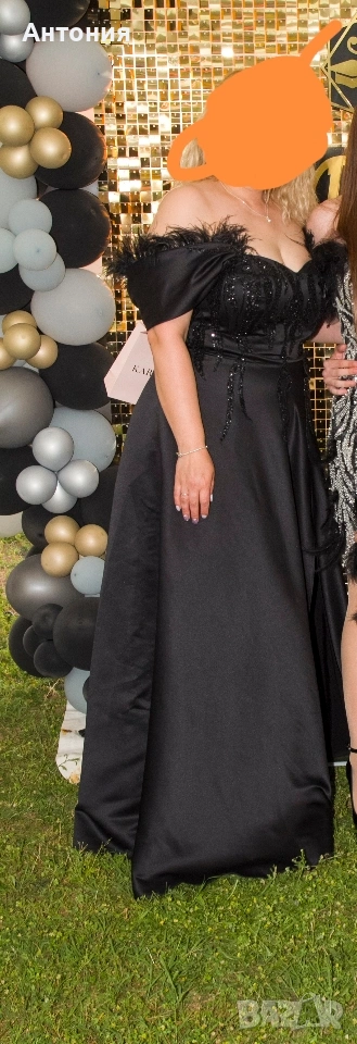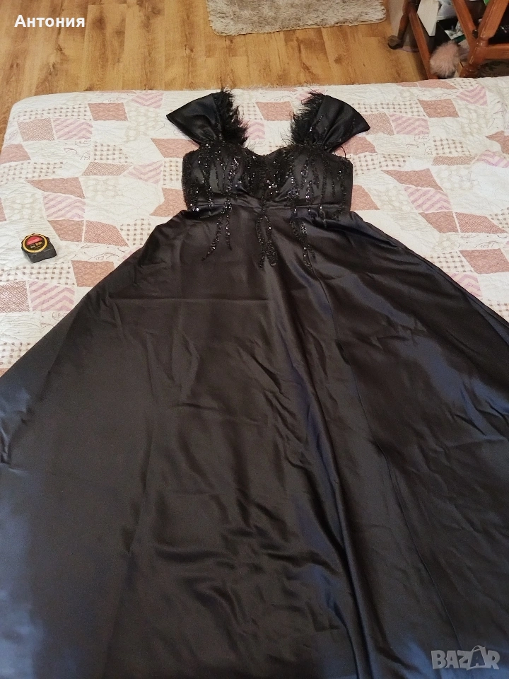 роклята стои много добре ,обличана веднъж.Има пера и цепка почти догоре,регулира се с корсет отзад.За по-високи дами или на висок ток