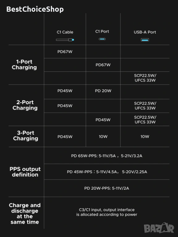 Интелигентен 3-портов изход: Тройният дизайн на 2C1A ви позволява да зареждате 3 устройства (напр. лаптоп, телефон, слушалки) едновременно. Интелигентното разпределение на мощността автоматично разпределя оптималната мощност. Поддържа синхронно зареждане, така че можете да презареждате външната батерия, докато тя зарежда вашите устройства.