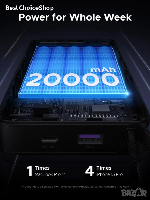 20000mAh мощност, готова за пътуване: Висок капацитет от 72Wh за безпроблемно пътуване с ръчен багаж. Преносимото зарядно устройство осигурява на вашия MacBook Air до 17,4 допълнителни часа или зарежда вашия iPhone 15 Pro приблизително 4 пъти. Изградена с първокласни 21700 литиево-йонни клетки за 500+ цикъла на зареждане, като същевременно поддържа над 80% капацитет.
