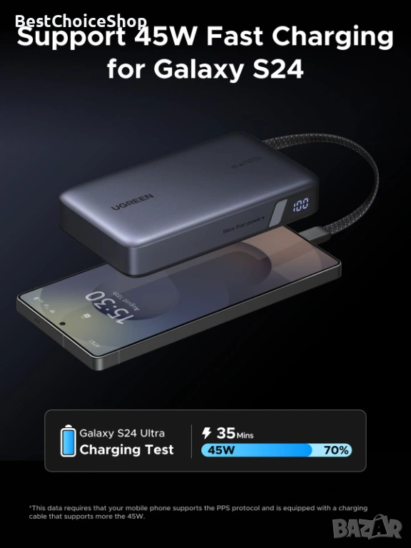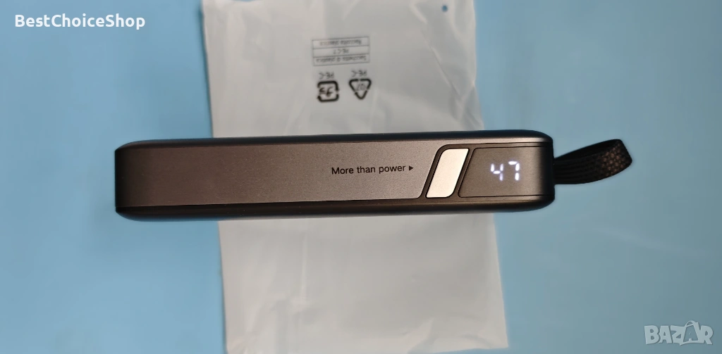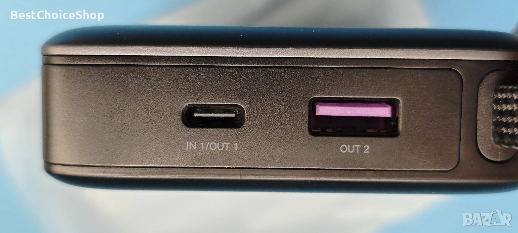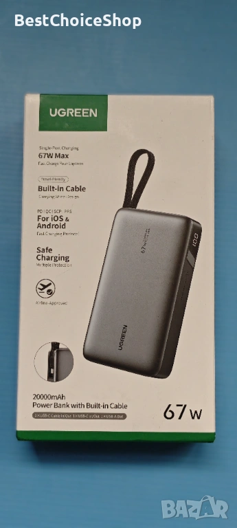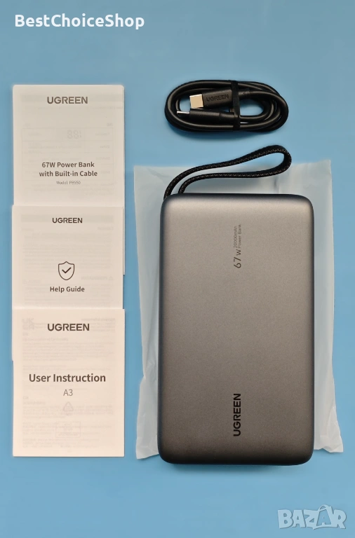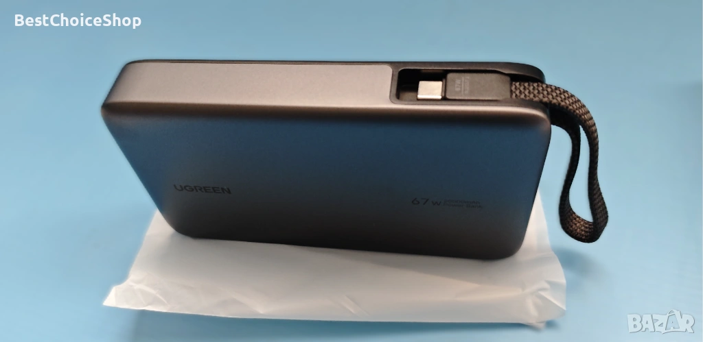 Вграден ултра-издръжлив USB C кабел: Включва вграден USB-C кабел с найлонова оплетка, стриктно тестван да издържи на над 10 000 огъвания и цикъла на включване. Вграденият дизайн намалява хаоса от кабели и може да се използва и като удобна каишка за носене. Поддържа както 67W изходна мощност за вашите устройства, така и 65W входна мощност за самозареждане.