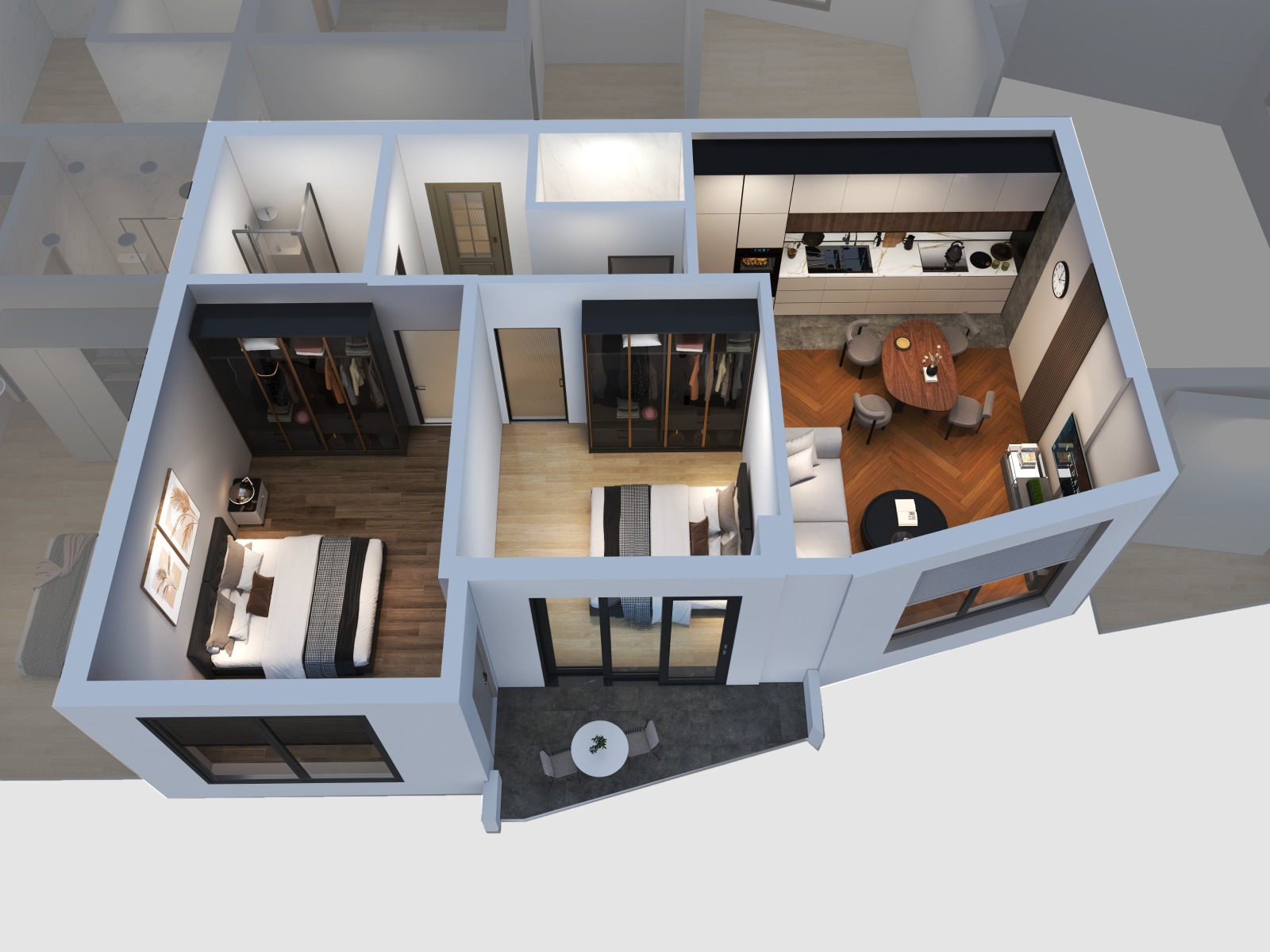 Представената 3D визуализация е в реалните размери на помещенията и показва примерно дизайнерско обзавеждане, което Ви дава ясна представа за потенциала на жилището.