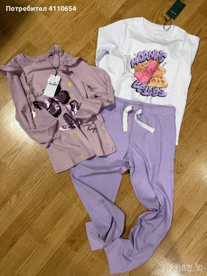 • Блуза 2 (дясно): Бяла блуза/тениска с къс или дълъг ръкав и щампа „Morning Besties“ с гофрети. Също с етикет.