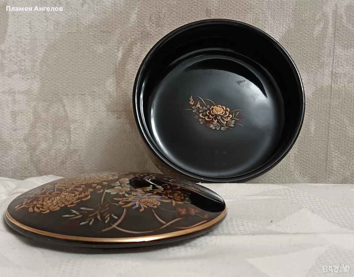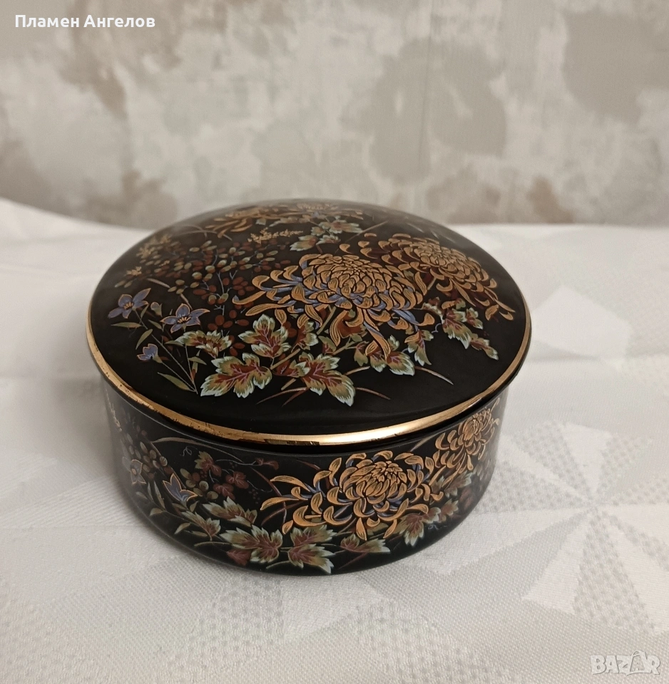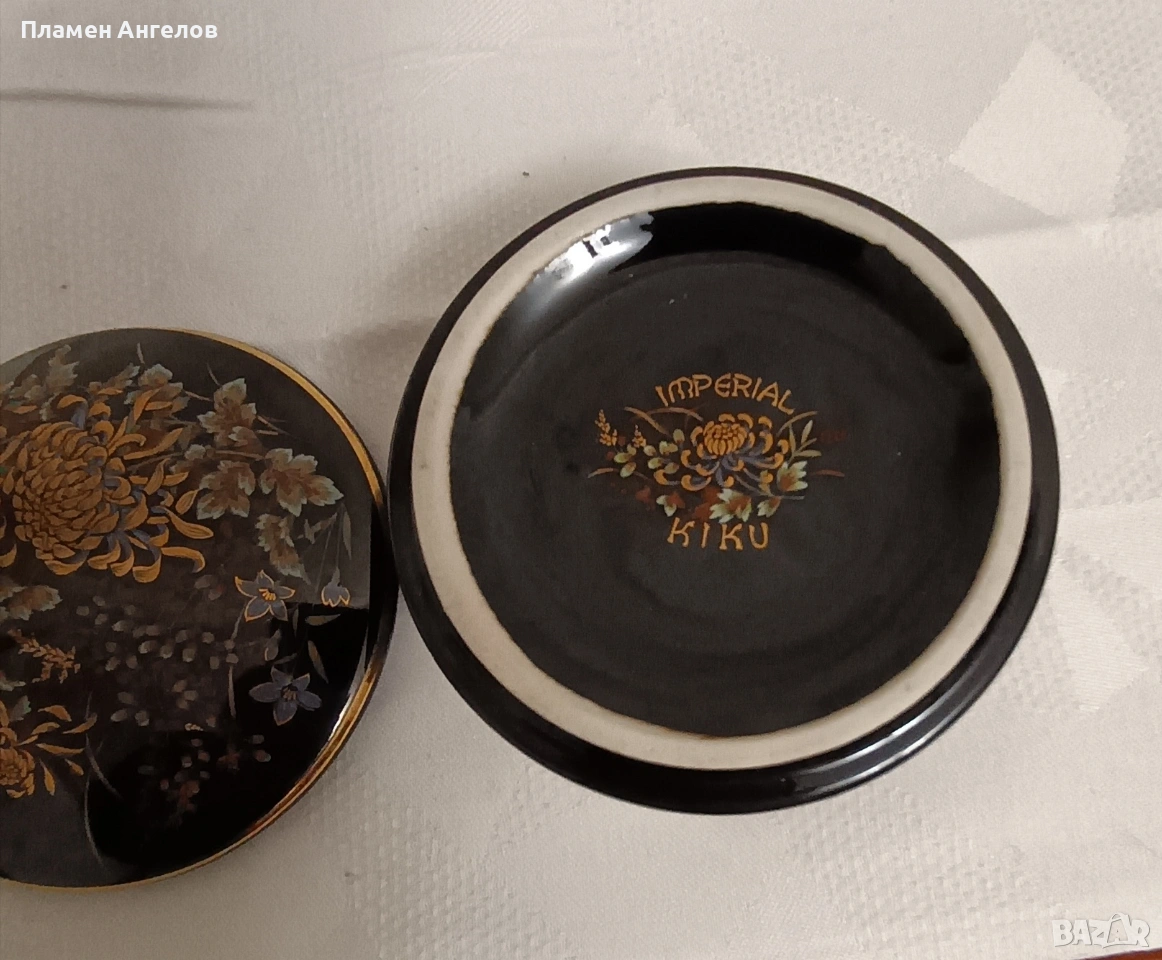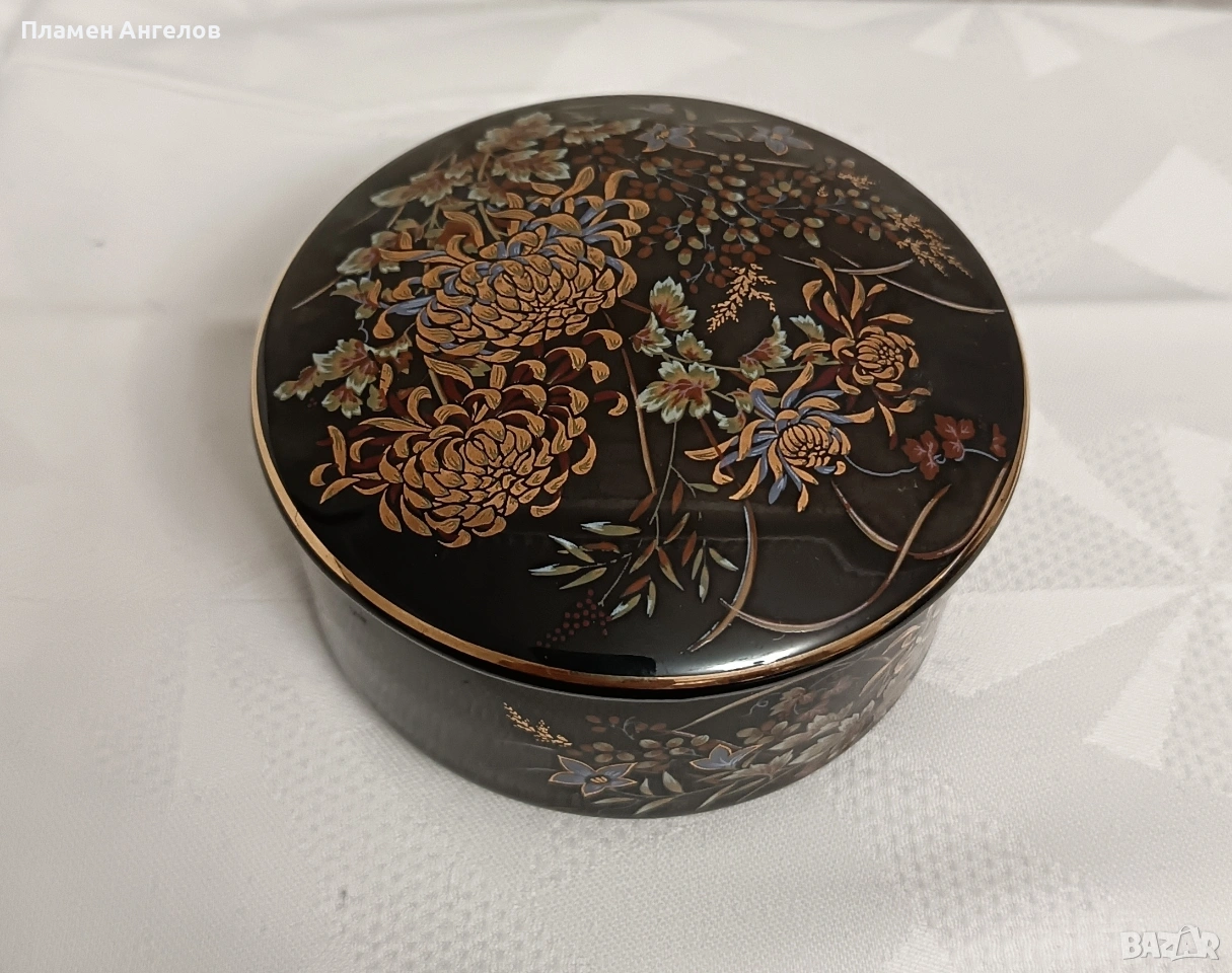 Изящна колекционерска кутия за бижута от известната японска серия Imperial Kiku. Предметът е в отлично състояние без забележки. Без чипове, без пукнатини. Произведена в Япония-Shibata Porcelain. Наситено черен гланциран порцелан с богат декор от хризантеми символ на японското императорско семейство. В азиатски винтидж стил около 1970те години. Ръчно рисувани елименти с фини акценти от истенско злато-22 карата. Висока 5.5см.диаметър 9.5см.