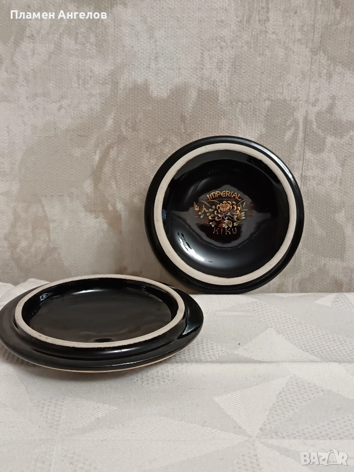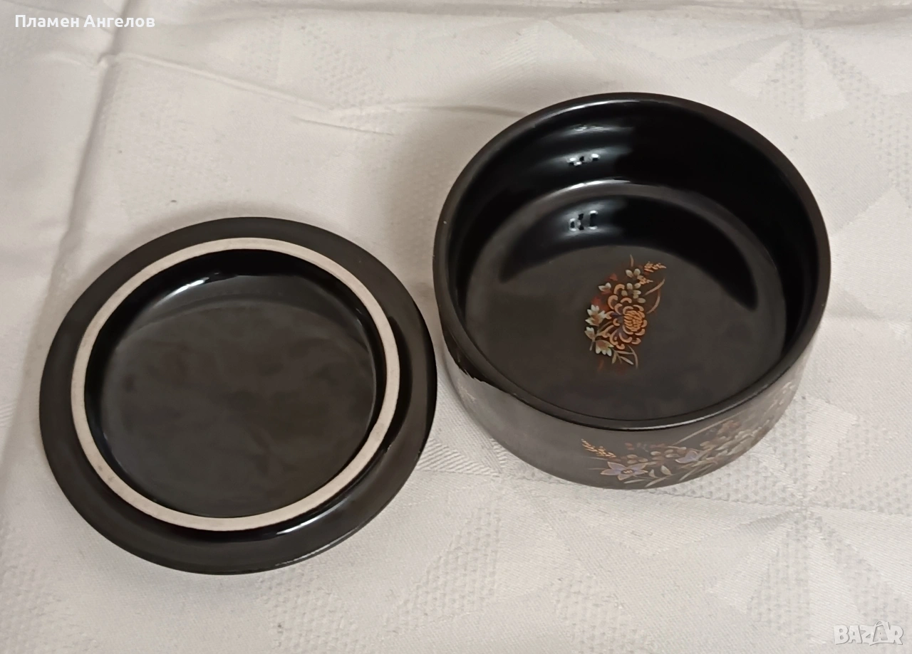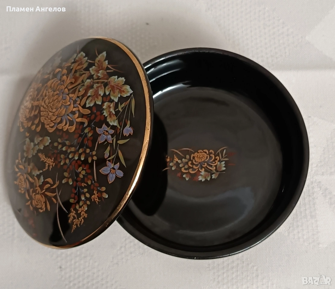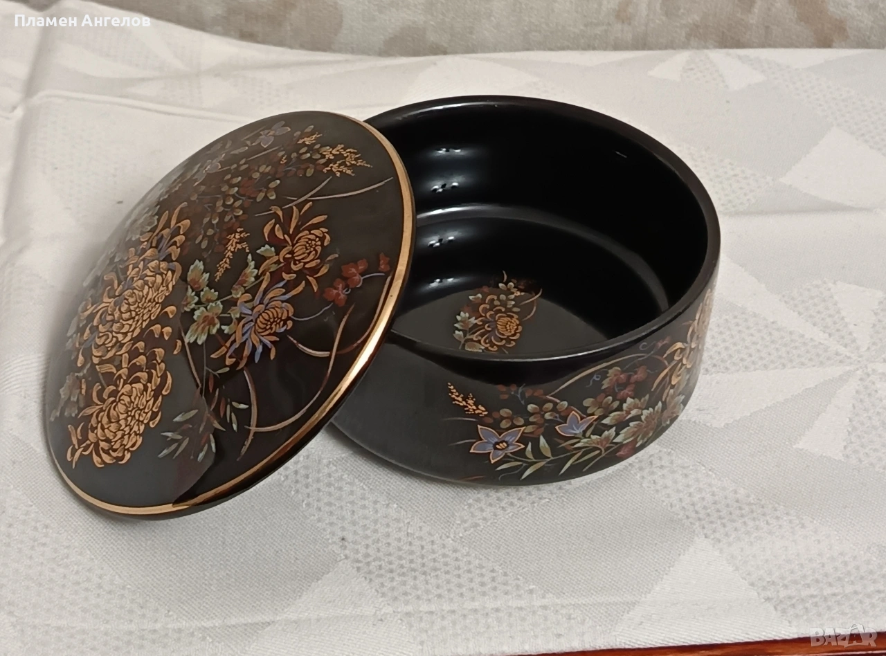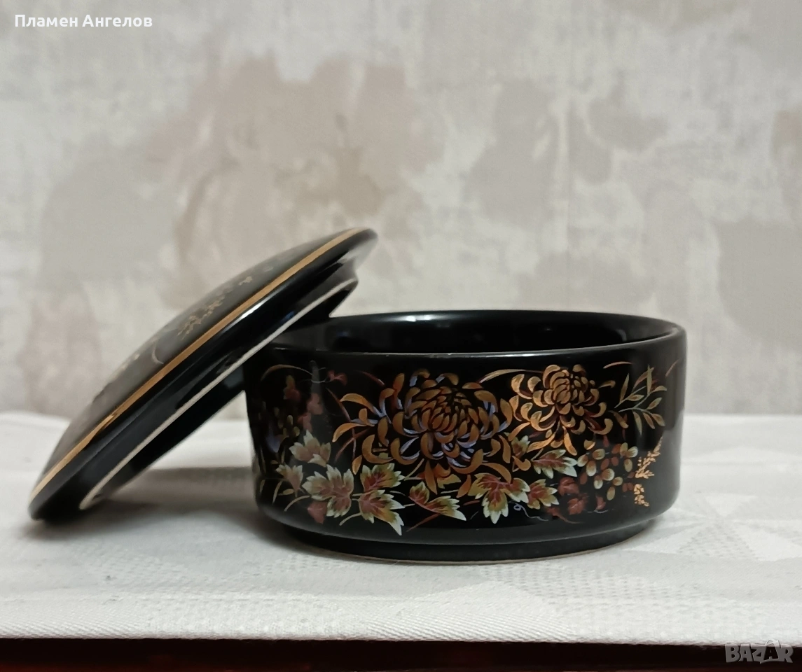 Изящна колекционерска кутия за бижута от известната японска серия Imperial Kiku. Предметът е в отлично състояние без забележки. Без чипове, без пукнатини. Произведена в Япония-Shibata Porcelain. Наситено черен гланциран порцелан с богат декор от хризантеми символ на японското императорско семейство. В азиатски винтидж стил около 1970те години. Ръчно рисувани елименти с фини акценти от истенско злато-22 карата. Висока 5.5см.диаметър 9.5см.