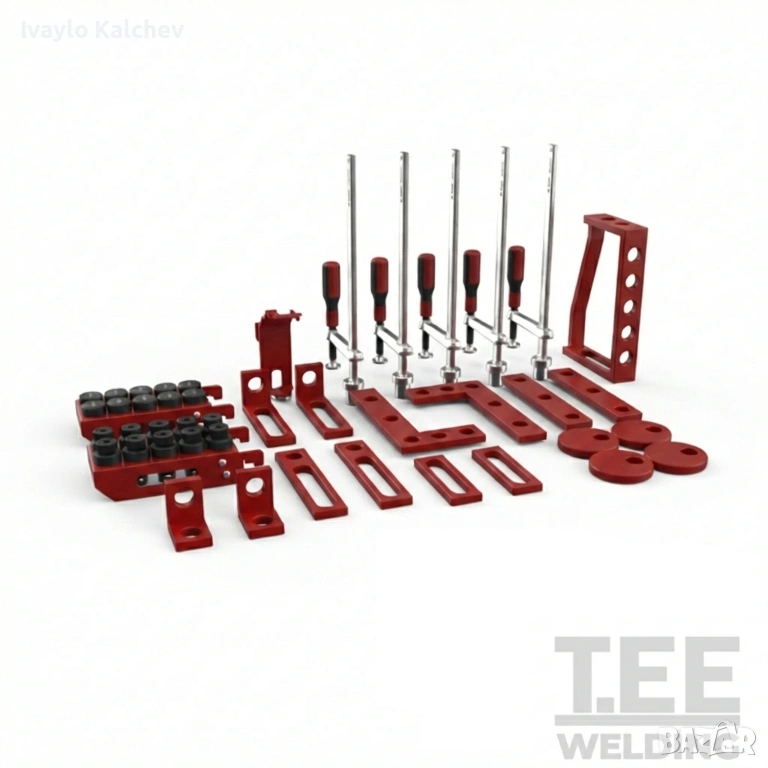 Комплектът е предназначен за работа върху заваръчни маси и осигурява бързо и стабилно фиксиране на детайли при заваряване и монтаж.