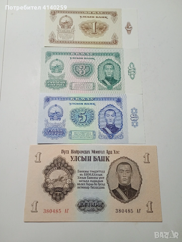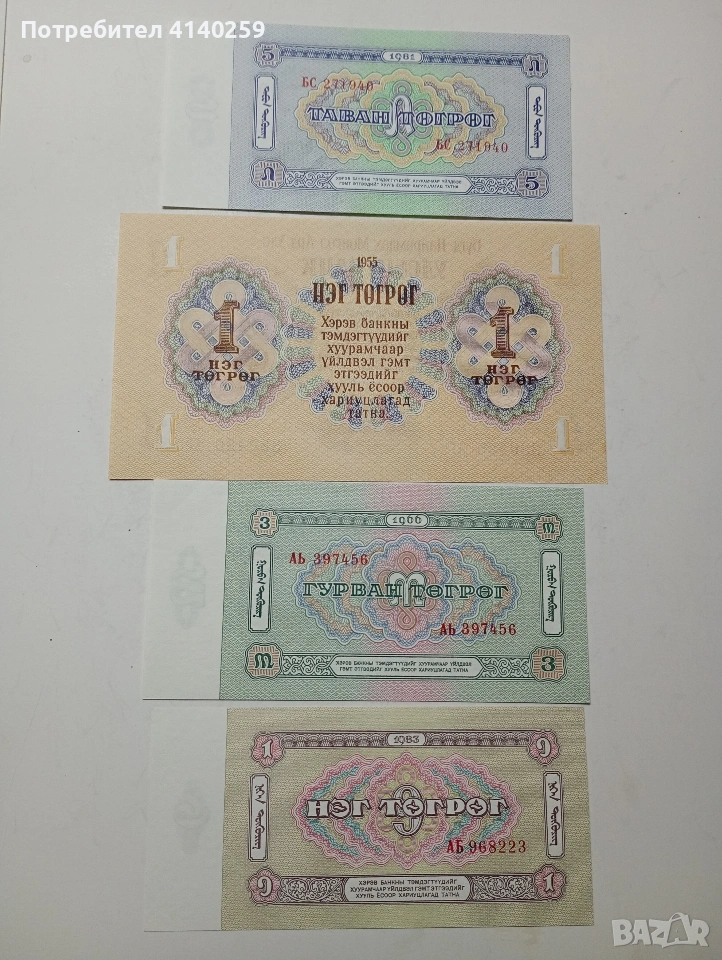 МОНГОЛИЯ БАНКНОТИ ЛОТ 1 ТУГРИК 1955 Г 1983 Г 3 ТУГРИК 1966 Г 5 ТУГРИК 1981 Г ЦЕНА ЗА 4 БРОЯ СЪСТОЯНИЕ НОВО ПОЛУЧАВАТЕ СНИМАНИТЕ БАНКНОТИ РАЗГЛЕДАЙТЕ ДРУГИТЕ МИ ОБЯВИ ДА КОМБИНИРАТЕ ДОСТАВКА ЕКОНТ ЗА ВАРНА ЛИЧНО