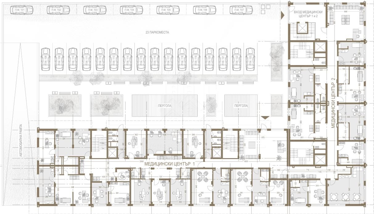 Предлагаме на вашето внимание имот с възможност за обособяване на множество кабинети, приемни, чакални, манипулационни, административна част и санитарни помещения, изцяло съобразени с нуждите на бъдещия наемател.
