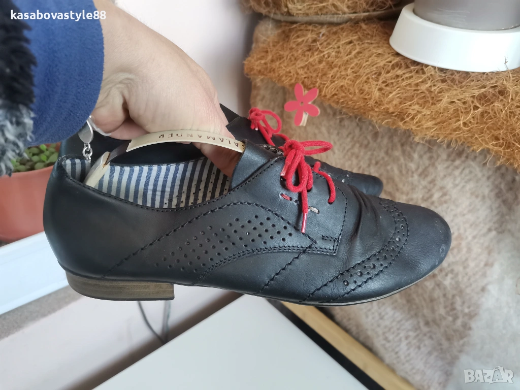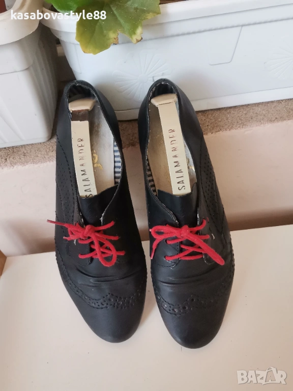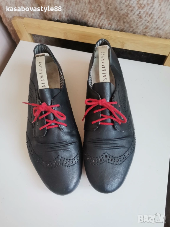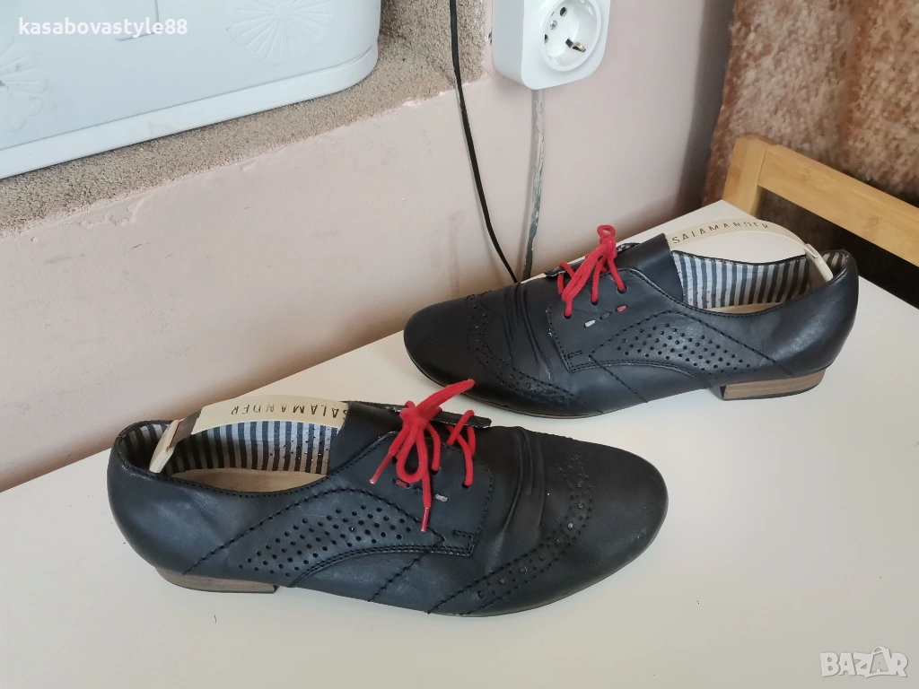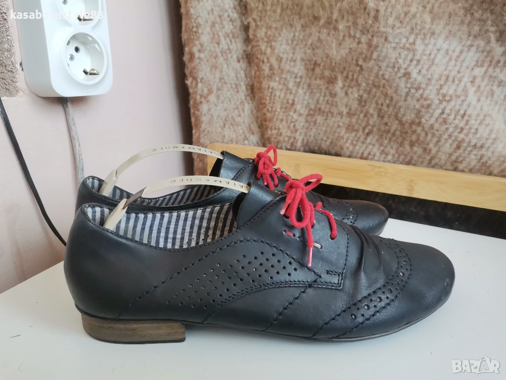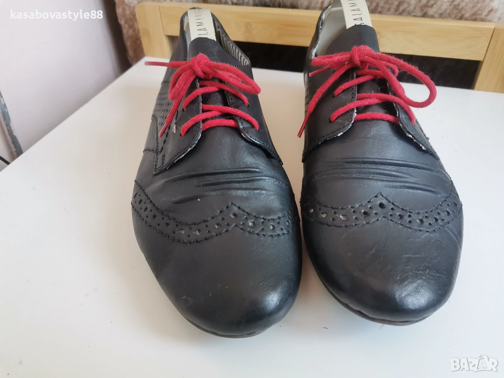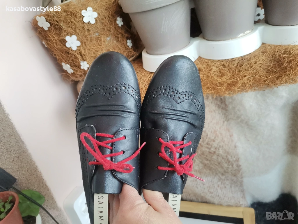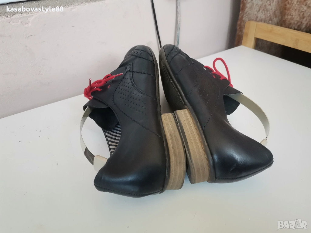 Дамски ежедневни обувки от естествена кожа в черен цвят и червени връзки. В перфектно състояние! /Изключително комфортен и олекотен модел, с ултра гъвкаво ходило и мека стелка отвътре. Токът е висок 1.5см Отговарят на 37.5н Дължина на стелка 24.5см.