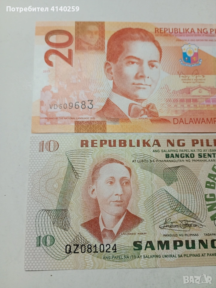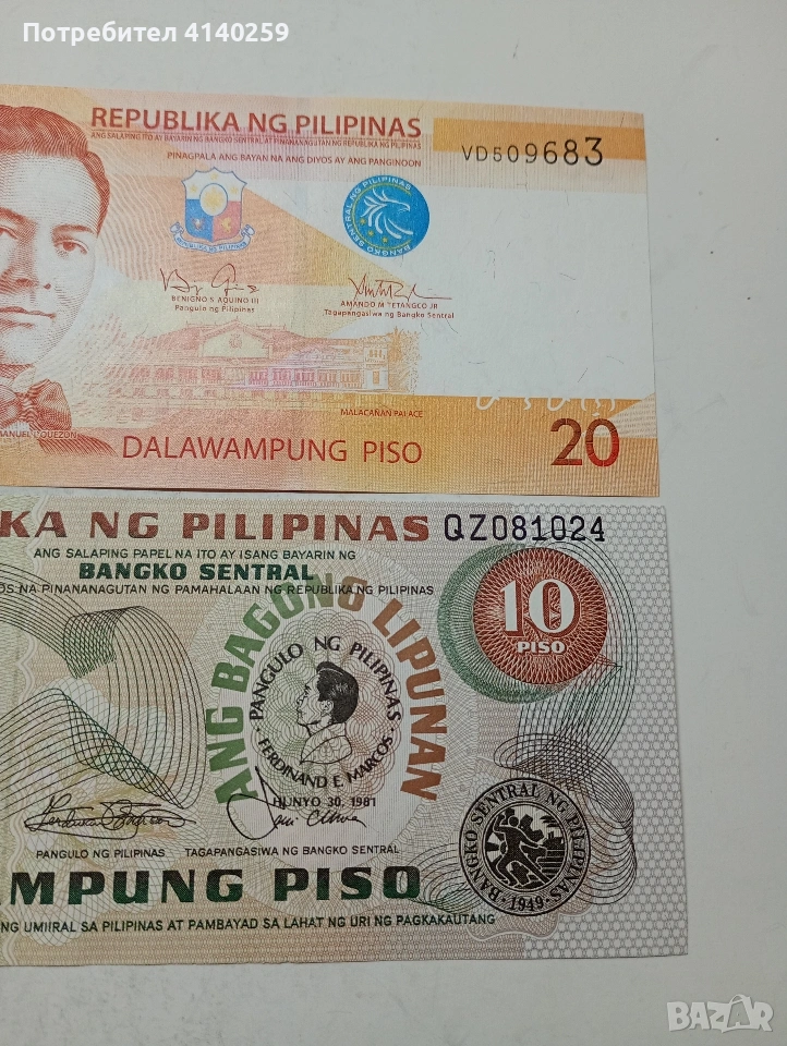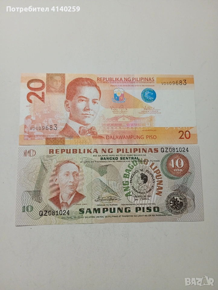 ФИЛИПИНИ БАНКНОТИ 20 ПИСО 2013 Г 10 ПИСО 1981 Г ЦЕНА ЗА 2 БРОЯ СЪСТОЯНИЕ НОВО ПОЛУЧАВАТЕ СНИМАНИТЕ БАНКНОТИ РАЗГЛЕДАЙТЕ ДРУГИТЕ МИ ОБЯВИ ДА КОМБИНИРАТЕ ДОСТАВКА ЕКОНТ ЗА ВАРНА ЛИЧНО