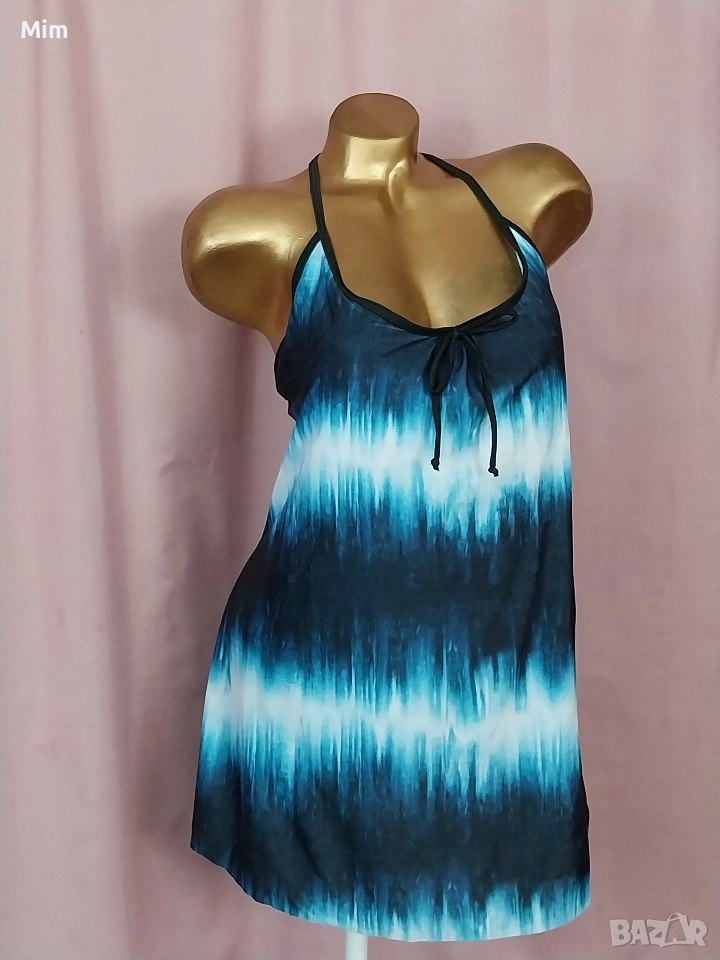 Бански/ танкини/ къса,еластична рокля, с подплънки който могат да се махат, гръдна от 110 до 130 см еластичност, ханш 120 до 150 см еластичност ,дължина 75 см Неразличим от нов без хартиен носител.