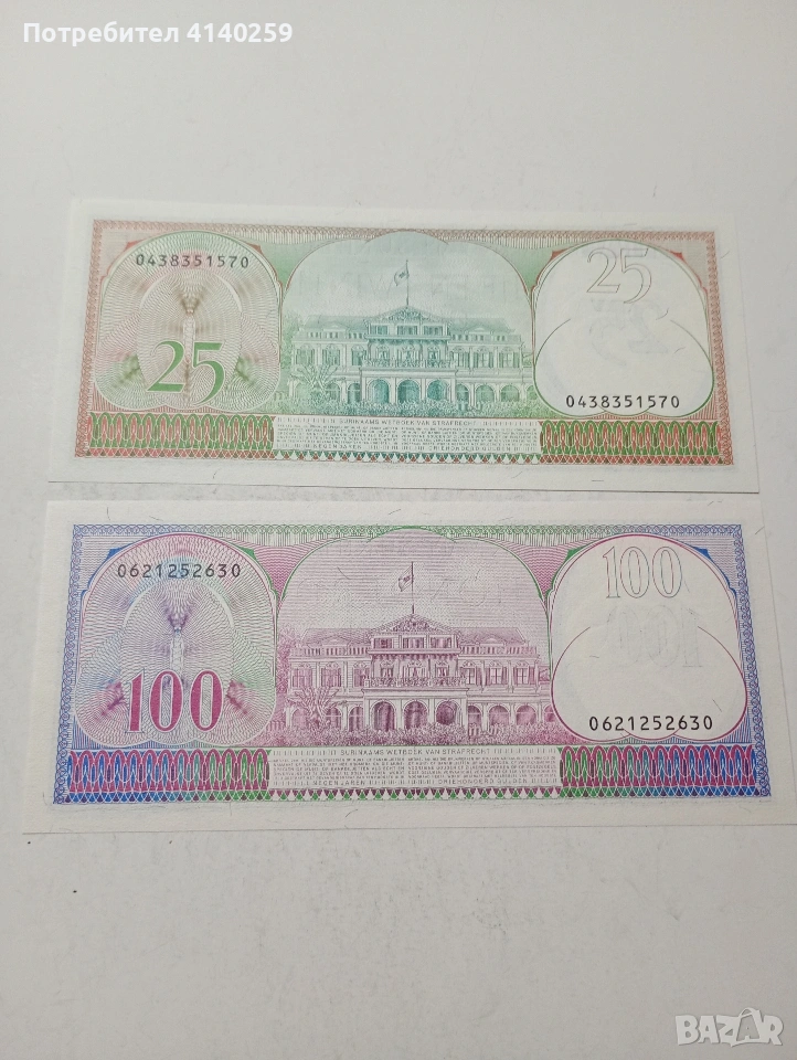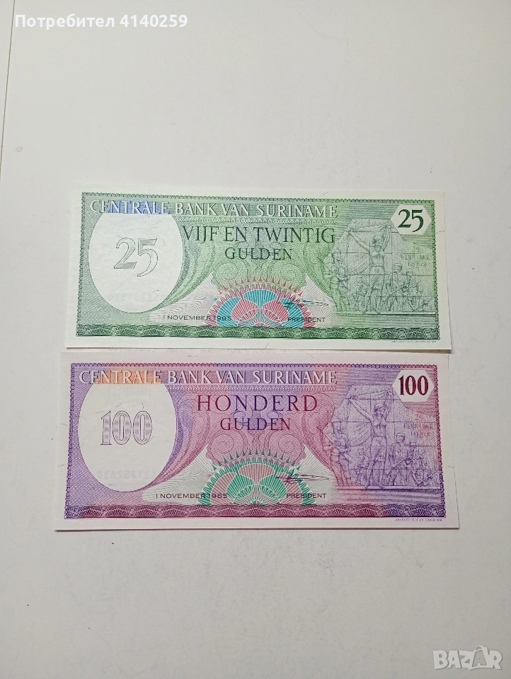 СУРИНАМИ БАНКНОТИ 100 ГУЛДЕНА 1985 Г 25 ГУЛДЕНА 1985 Г ЦЕНА ЗА 2 БРОЯ СЪСТОЯНИЕ НОВО ПОЛУЧАВАТЕ СНИМАНИТЕ БАНКНОТИ РАЗГЛЕДАЙТЕ ДРУГИТЕ МИ ОБЯВИ ДА КОМБИНИРАТЕ ДОСТАВКА ЕКОНТ ЗА ВАРНА ЛИЧНО