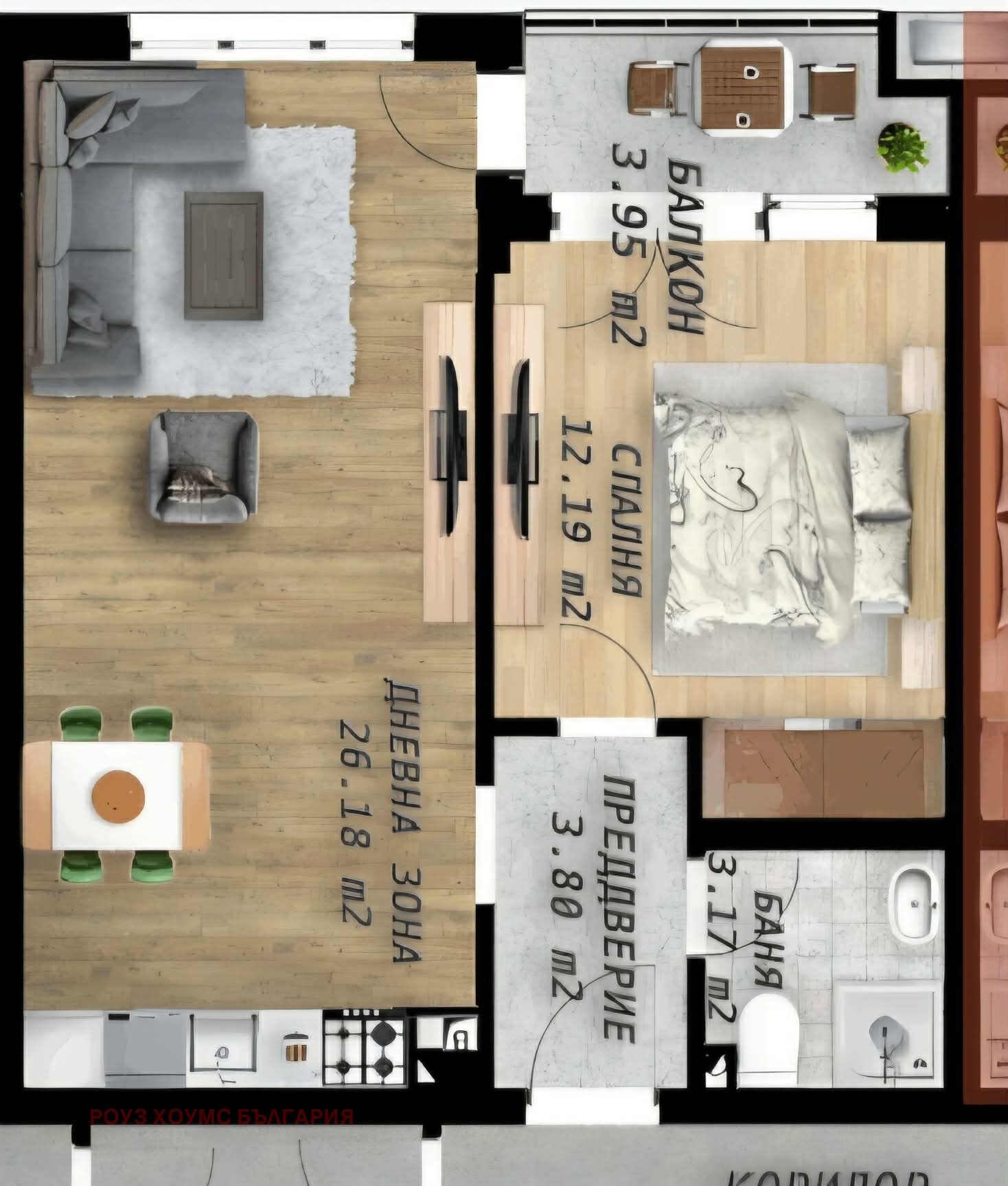 Разпределение - предверие, дневна с кухненски бокс, спалня, баня с тоалетна и тераса