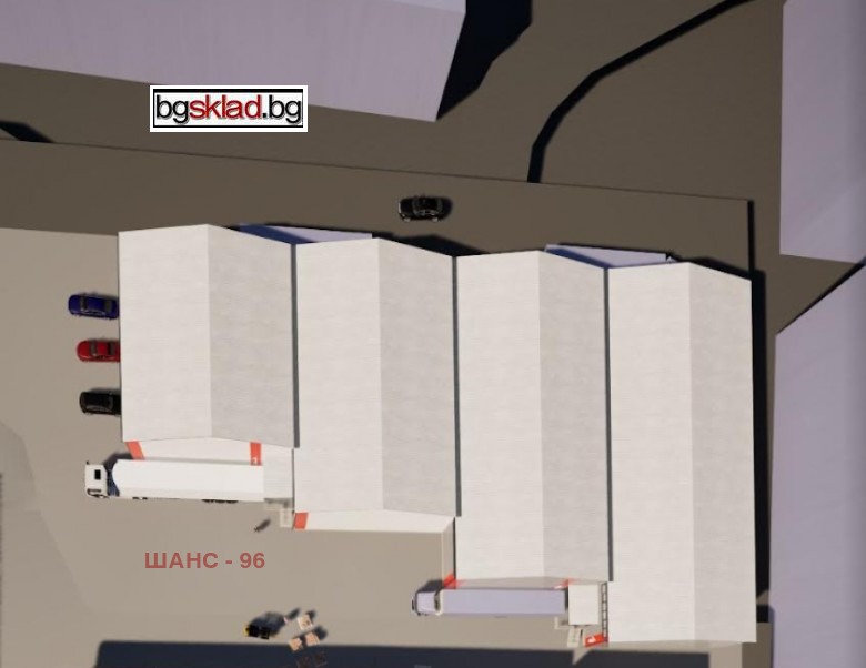 Ново хале под наем с площ 553 м2, разполагащо с две товарни врати, едната от които ползва заедно със съседен склад 1/2 от обща ТИР рампа, която е 12 м2. Халето ще бъде изградено в рамките на 4 месеца от подписване на предварителен договор за наем и внасяне на депозит от страна на наемателя.