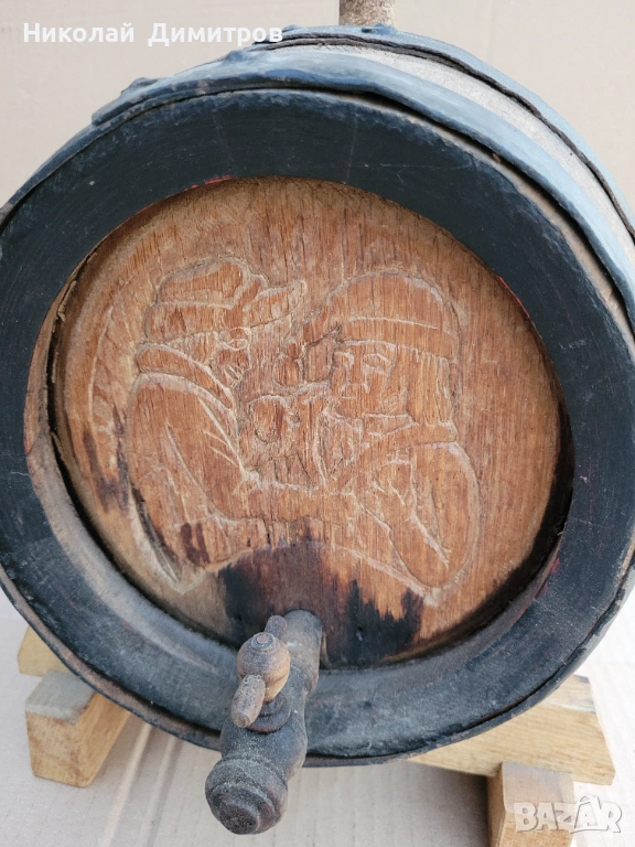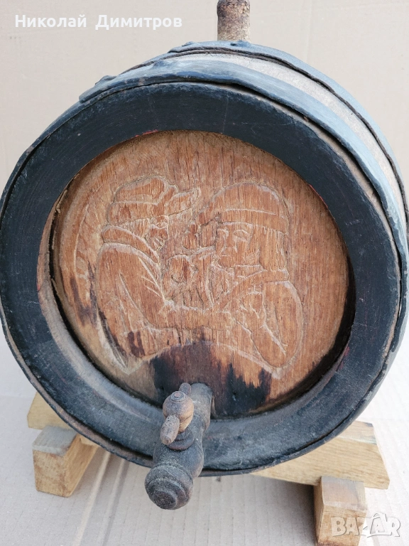 Продавам автентично немско малко буре, подходящо за декорация на механи, битови кътове или подарък. Предният капак е с красива ръчна дърворезба, изобразяваща традиционна сцена.