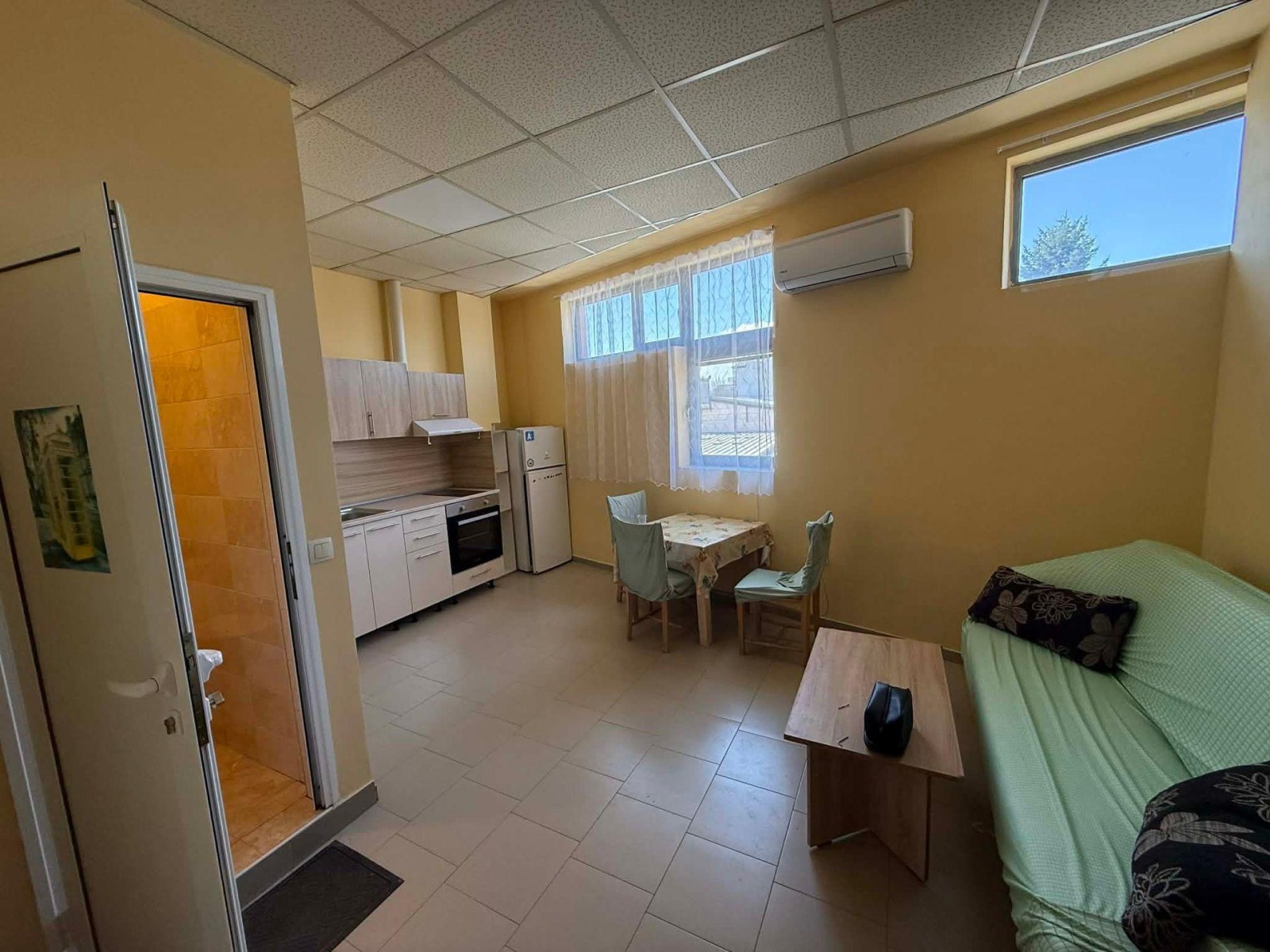 Апартаментът е напълно обзаведен и готов за нанасяне, отоплява се на ток, разполага с климатик.