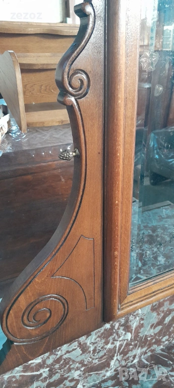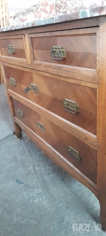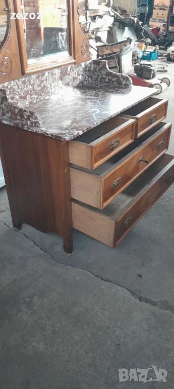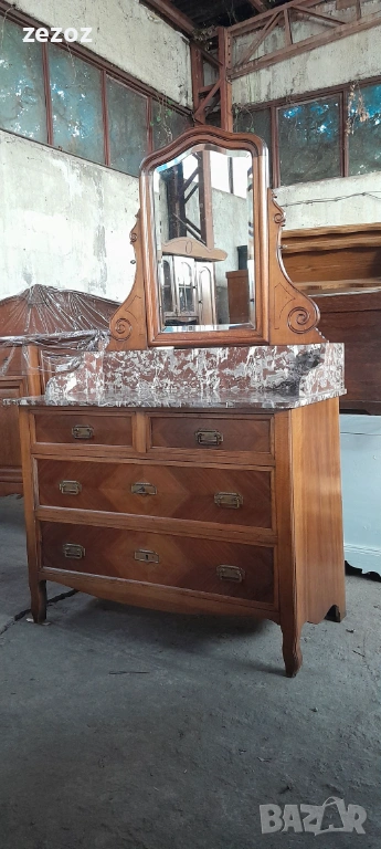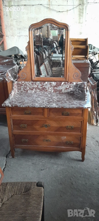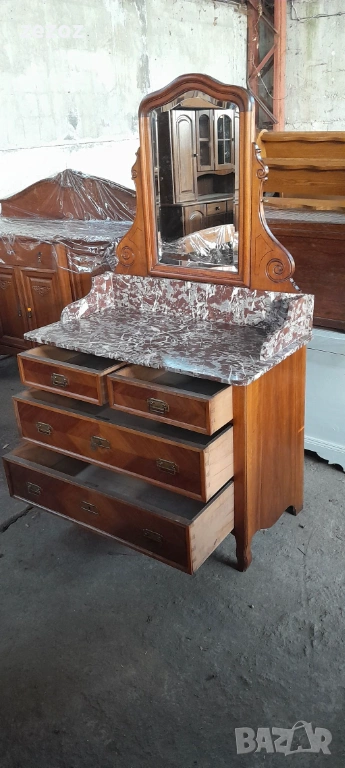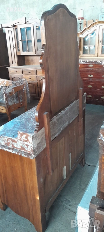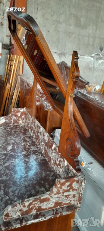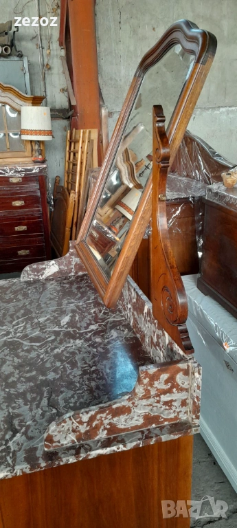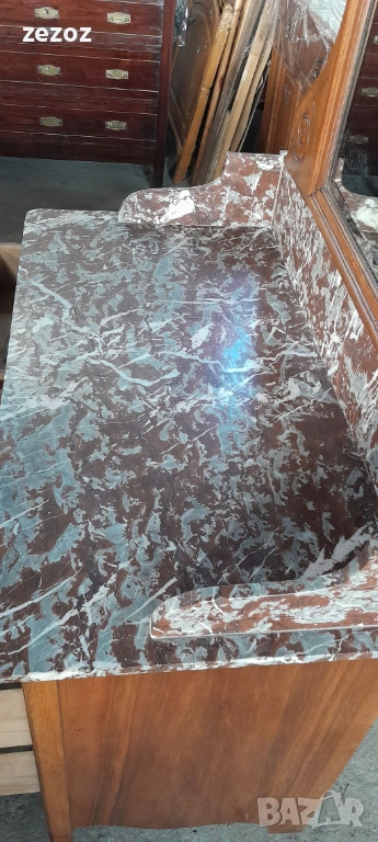 Антикварен тоалетен шкаф.Дизайн от края на 19 началото на 20 век. С естествен мрамор"Червен леопард".Пълен масив.Фасетно подвижно огледало с патина от времето.Месингови орнаменти.За годините си шкафа е добре запазен.Снимана е поправка на горния плот.Габаритни размери-