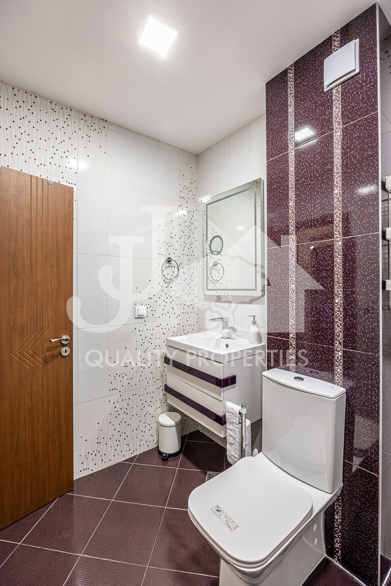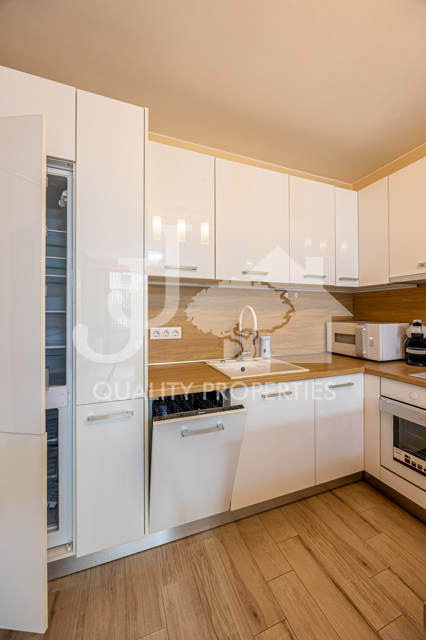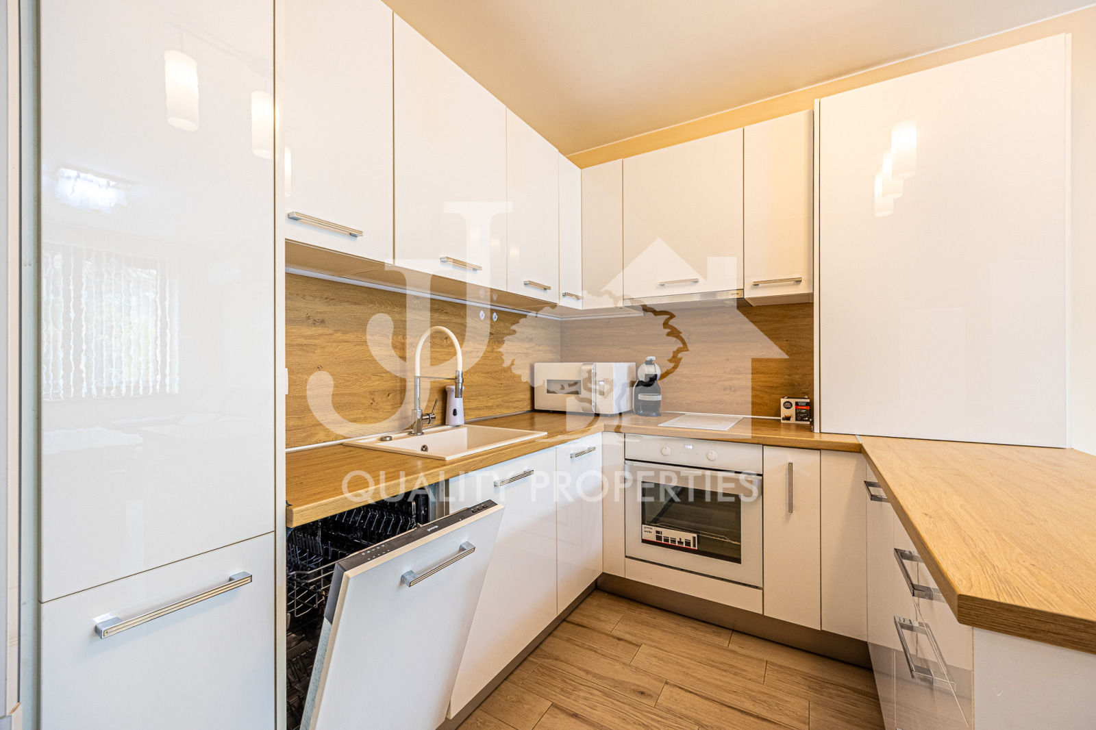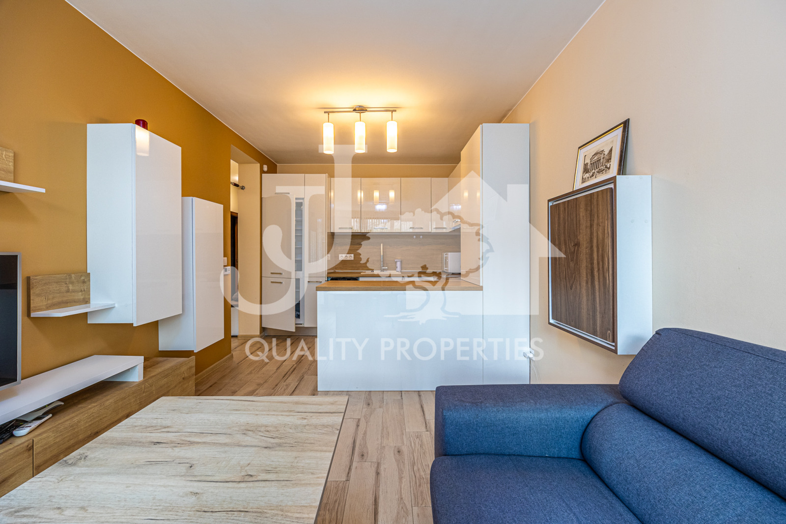 Апартаментът е с изцяло южно изложение и е със следното разпределение: входно антре и коридор с удобно вградено мокро помещение, където е разположена пералната машина, всекидневна с напълно оборудвана кухня и с излаз на остъклената тераса / веранда, стая с гардеробна към нея, също с излаз на терасата, и баня с тоалетна. Кухнята е напълно оборудвана с всички необходими уреди - голям хладилник с фризер, съдомиялна машина, фурна, котлони, абсорбатор, кафе машина, микровълнова фурна и много и просторни шкафове за съхранение. Отоплението е на газ - подово отопление, без радиатори, за да може да е равномерно топло във всяко помещение, като на разположение има и инсталиран климатик. В апартамента има инсталиран СОТ.