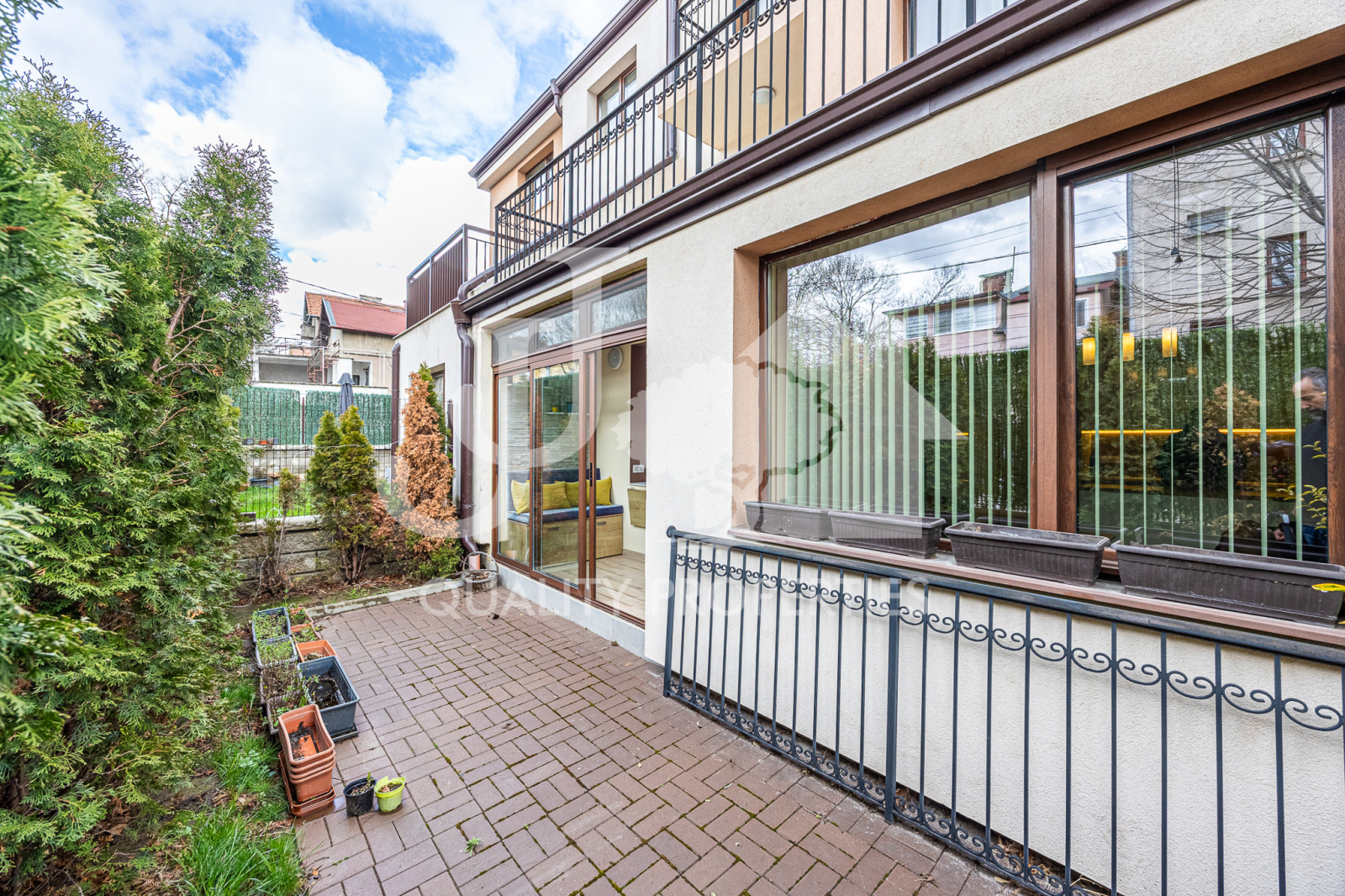 Апартаментът се намира се на партерен етаж, в модерна жилищна сграда от 2020-та година. Апартаментът е с чиста застроена площ от 56 кв.м и РЗП 65 кв.м, допълнително има и самостоятелен обособен двор с площ от 25 кв.м с достъп от всекидневната и спалнята. Към апартамента, включени в наемната цена, има и едно паркомясто, намиращо се във външния паркинг на сградата!