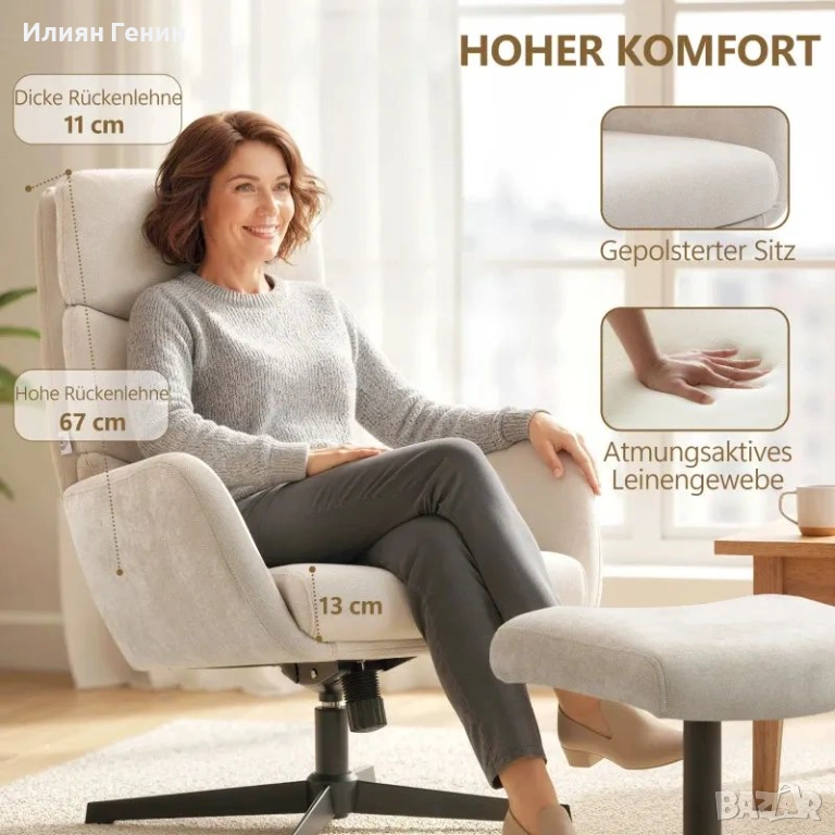 Дишащ комфорт: Потопете се в подплатената седалка с дебелина 13 см и облегалката с дебелина 11 см с двуслоен дизайн. Тапициран с дишаща материя, имитиращ лен, този фотьойл гарантира целогодишен комфорт – идеален за четене, гледане на телевизия или релакс след дълъг ден.