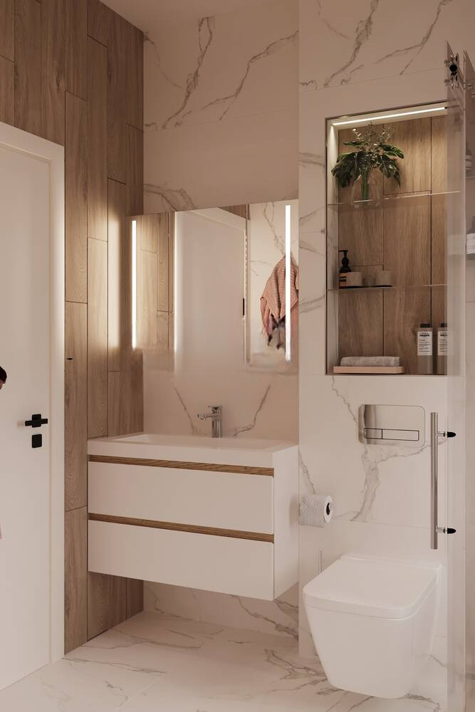 Имотът има следното практично разпределение: Просторен хол с трапезария и кухня, три светли спални, две бани с тоалетни, перално помещение и килер.