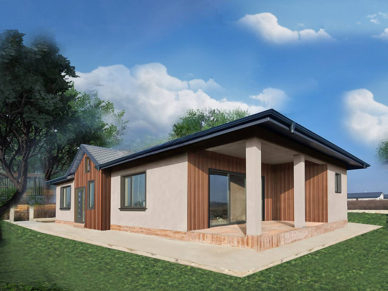 Къщата е тип сглобяема конструкция. Разполага с 80 кв.м таванско пространство със сгъваема стълба и възможност за допълнителна стая, офис, фитнес, дрешник или склад. Има и голяма веранда с уникална гледка към Родопите.