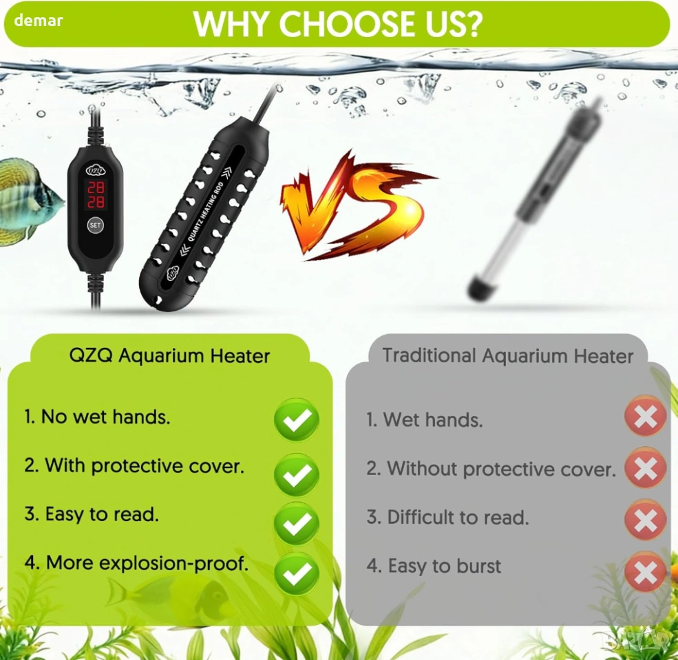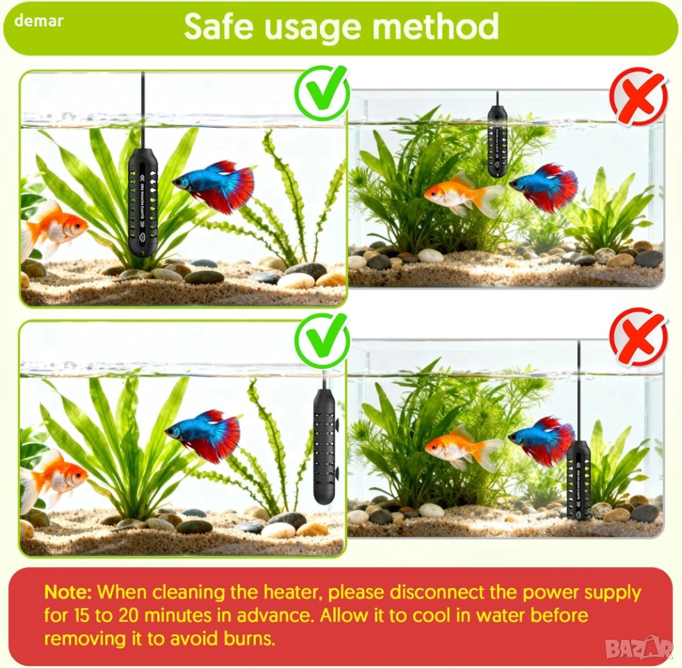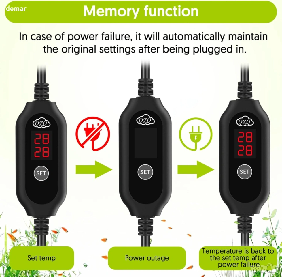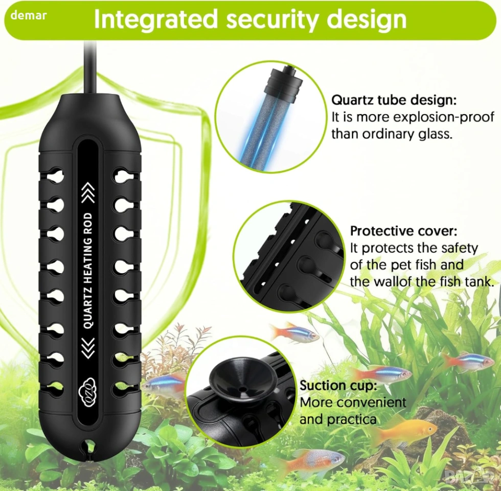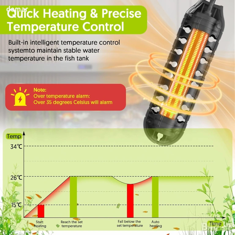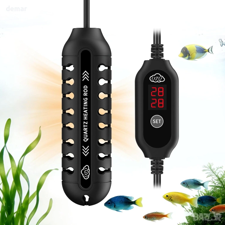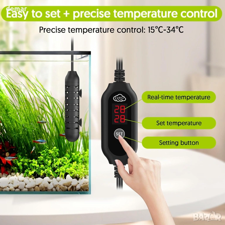 Компактен нагревател за аквариум с външен LED контролер за температура, позволяващ прецизно регулиране между 15°C и 34°C, показващ както текущите, така и зададените температури за лесно наблюдение. Разполага с интелигентен термостат, който автоматично поддържа стабилни условия на водата чрез повторно загряване, когато температурите паднат. Изработен с взривоустойчива кварцова тръба и защитен капак, той предлага издръжливост, устойчивост на корозия и допълнителна безопасност за рибите. Нагревателят включва функция за памет, която възстановява предишните настройки след прекъсване на захранването, а напълно потопяемият дизайн с дълъг захранващ кабел и вендузи позволява гъвкав и лесен монтаж.