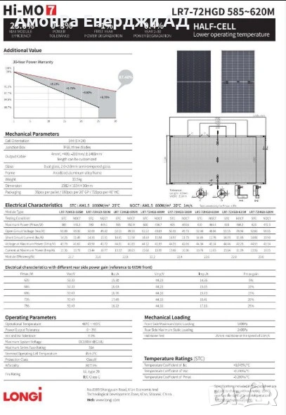 LONGi HI-MO 7 LR5-72HGD-585 е високоефективен монокристален двулицев фотоволтаичен модул от най-ново поколение, разработен за максимална производителност в търговски и индустриални соларни инсталации. Благодарение на HPDC клетъчната технология, half-cell дизайна и двойното стъкло, модулът осигурява по-ниски загуби, по-висок енергиен добив и отлична устойчивост във времето.
