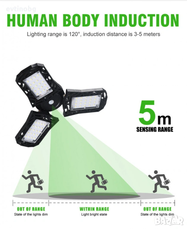 Индукционен обхват: 3-5 метра с 120° ъгъл на осветление, което осигурява ефективно покритие на голяма площ.
