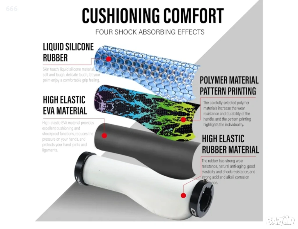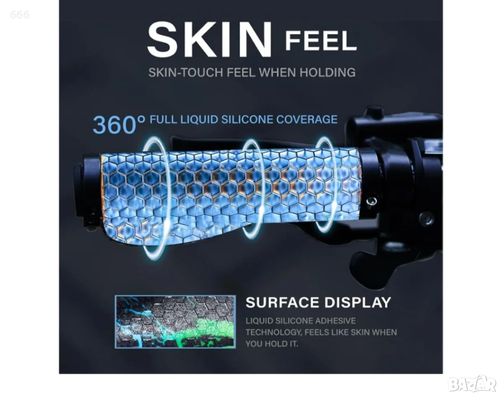 4-степенна амортизация + силиконов дизайн: 4-степенна ергономична дръжка с амортизация, проектирана да увеличи комфорта при каране, като по време на дълго каране тялото няма да се чувства неудобно; Външният силиконов мрежест дизайн на дръжката за планинско колоездене осигурява по-добро неплъзгащо се сцепление и управление по време на каране.