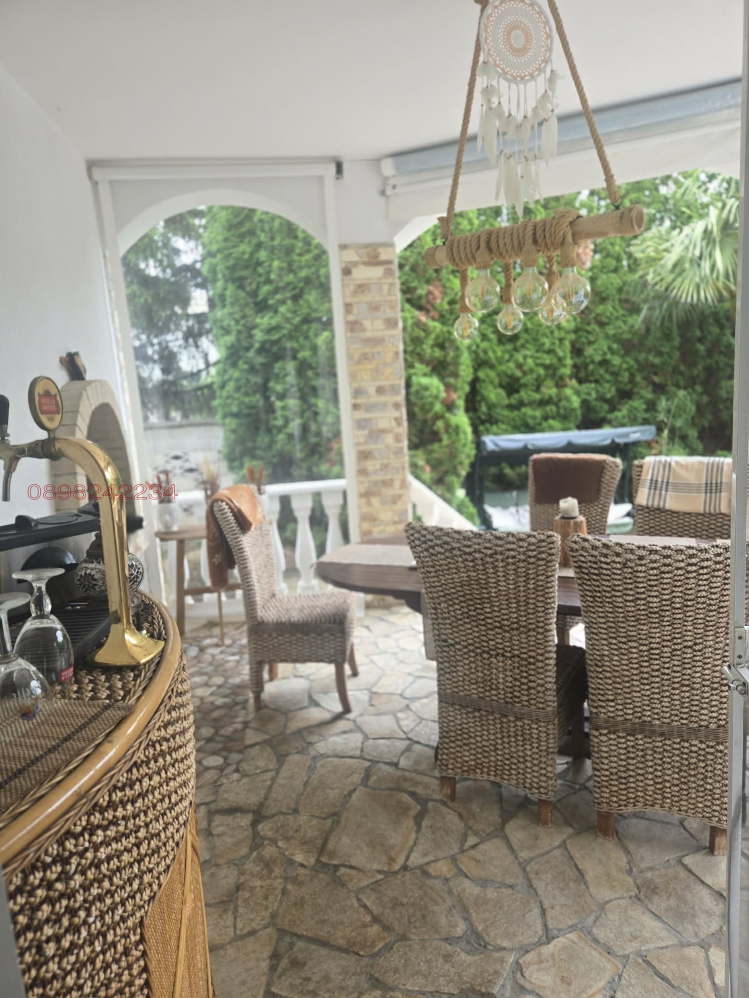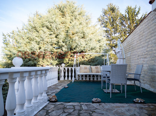 Голяма всекидневна с дизайнерски мебели,италианки гранитогрес и венецианска мазилка,френска камина с облицовка-мрамор. Тераса с достъп към басейна и градината,тухлено барбекю и бар за наливна бира.