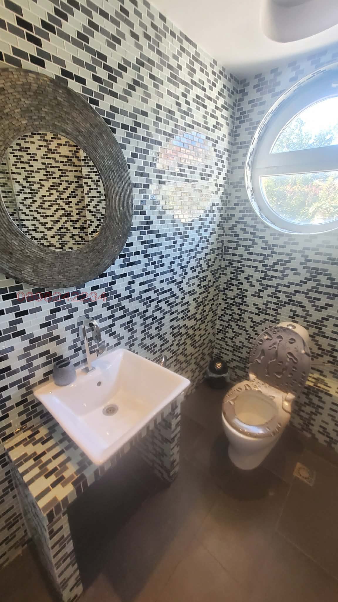 Дворът включва: озеленена градина с дървета на 10м.,палми над 5м.,алпинеум с банбукова стена,поливна система ,отопляем басейн (8 по 4),фонтан с делфин и джакузи за 4 човека.