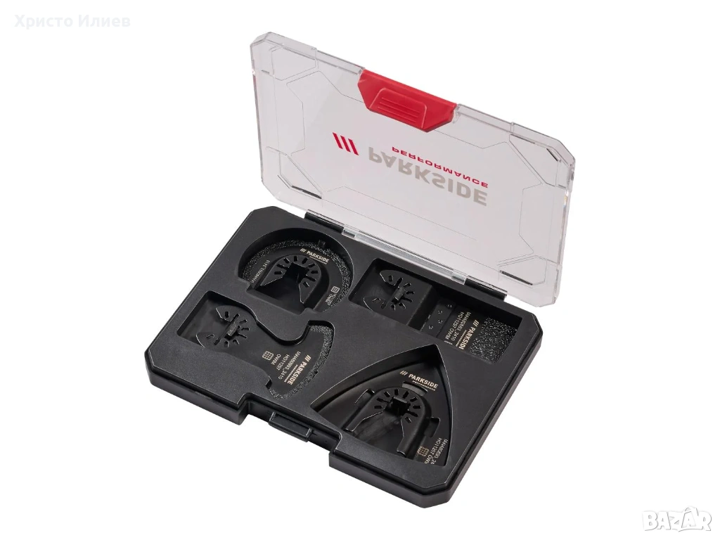• 1x полукръгъл трион (Ø 64 мм), 1x делта рашпиля (78 мм), 1x сегментен трион (34 мм), 1x сегментен трион (58,7 мм)