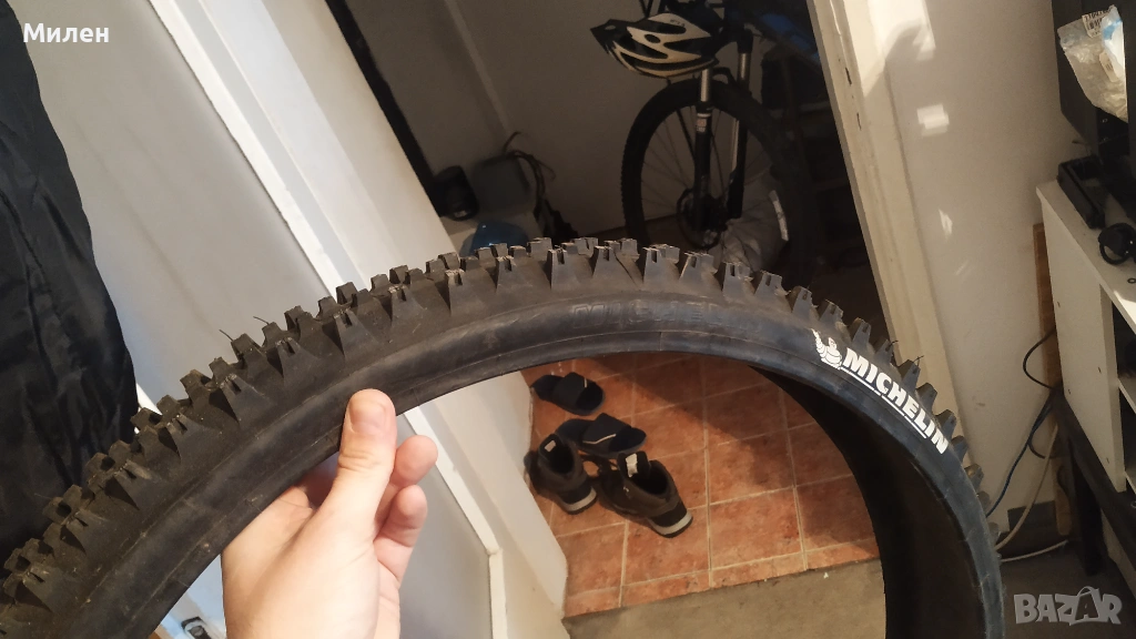 Външна гума Мишелин, веднъж карана, вече не ми трябва че нямам на какво да я карам. Съвместима с безкамерни системи. По шарка е по-подходяща за задна, за Ендуро или АМ/планинско