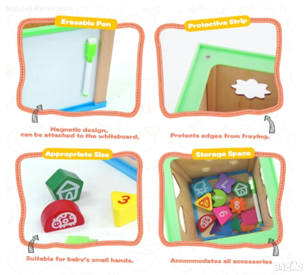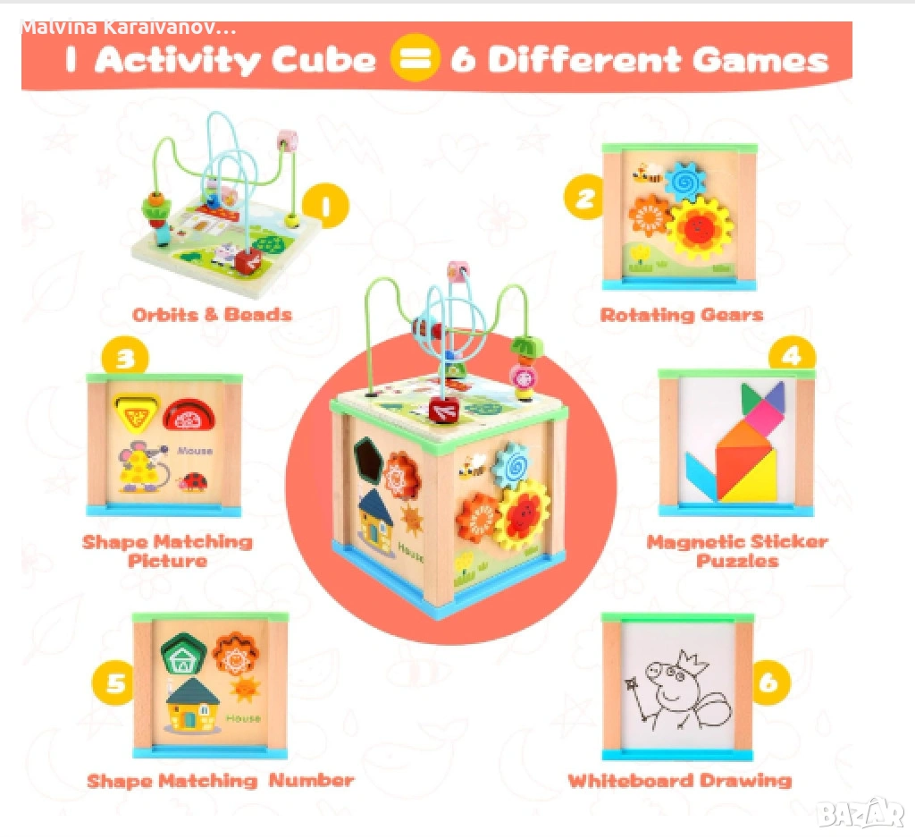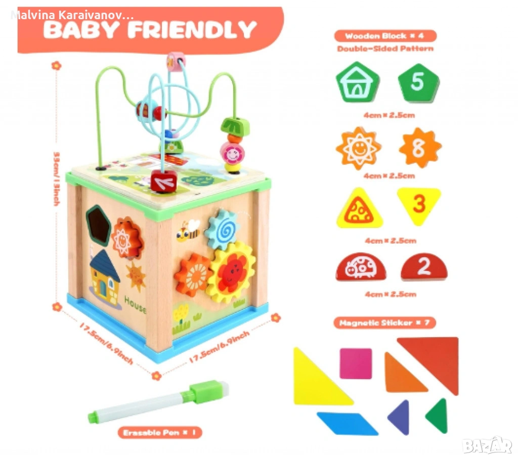 Монтесори сортер "Дървено кубче 6 в 1" е развиваща играчка, предназначена за деца над 1 година, която подпомага тяхното когнитивно и моторно развитие. С размери 17,5 × 17,5 × 30 см, кубчето предлага шест различни дейности, включително: Лабиринт с мъниста – за развиване на фината моторика; Съпоставяне на форми – за подобряване на логическото мислене и координацията ръка-око; Зъбни колела – за стимулиране на моторните умения и въображението; Статив – за развиване на сръчност и концентрация; Магнитен пъзел – за работа с цветове и форми; Разпознаване на цветове – за развитие на визуалната възприятия и когнитивните способности;