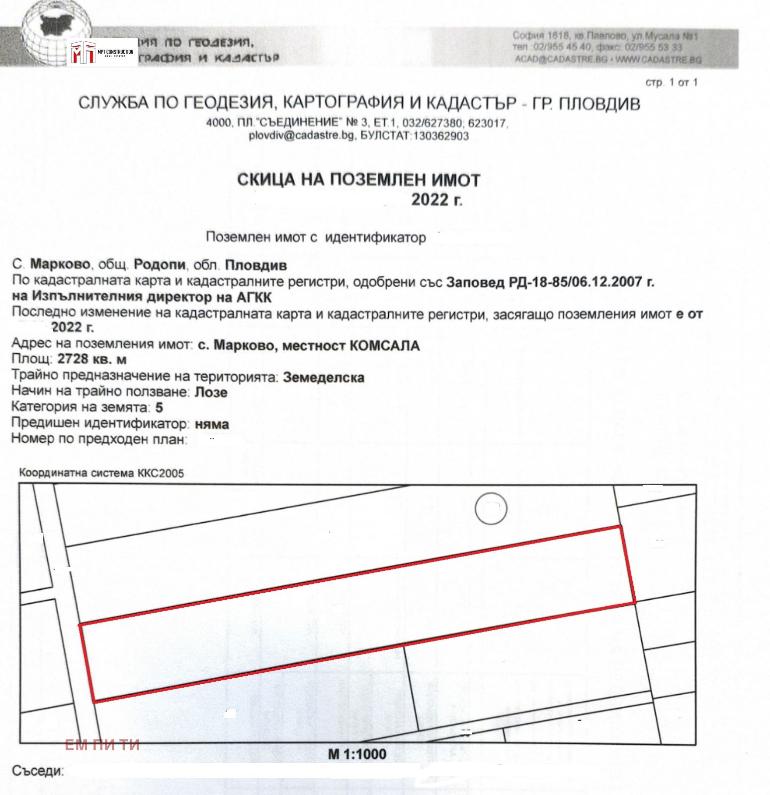 А-я Ем Пи Ти предлага за продажба парцел с площ от 2728 кв.м., в местност 'Комсала', стария път за с.Марково. Имотът е в края на процедурата за смяна на статут за Жилищно строителство, не са обособявани отделни УПИ-та. Подходящ е за фамилна къща, или редово стритеслтво на няколко къщи. КИНТ - 1.2 !!! Отстояние от асфалтов път около 60-70м. В района се строят нови къщи.! Страхотна гледка към Родопите, чист Въздух!!! Огледи с уговорка! 0898959107