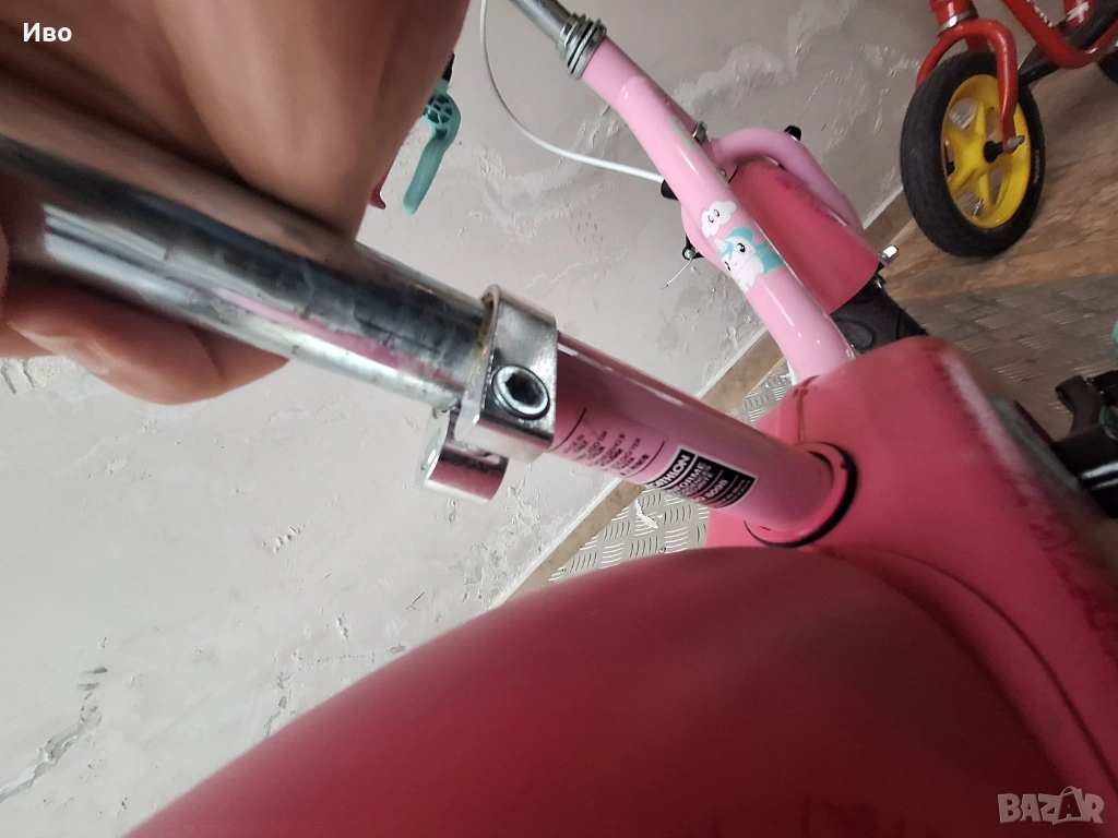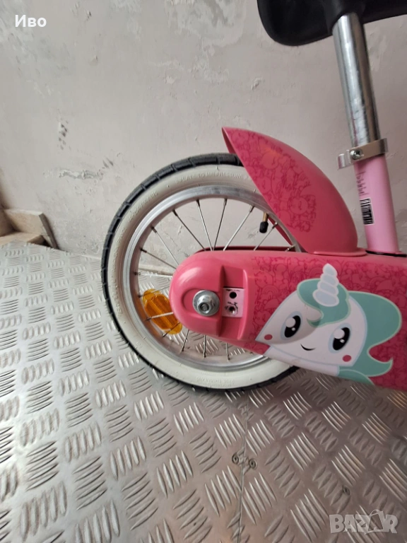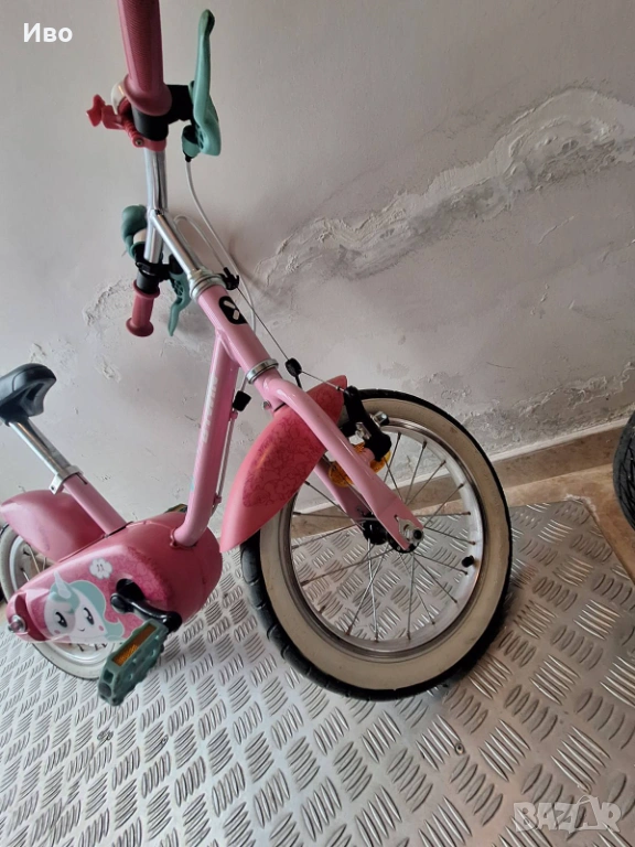 Детско колело B"TWIN 14* розово брандирано с еднорог. Към колелцето има спомагателни колелца както и дълга дръжка за подпомагане при махнати помощни колелца.