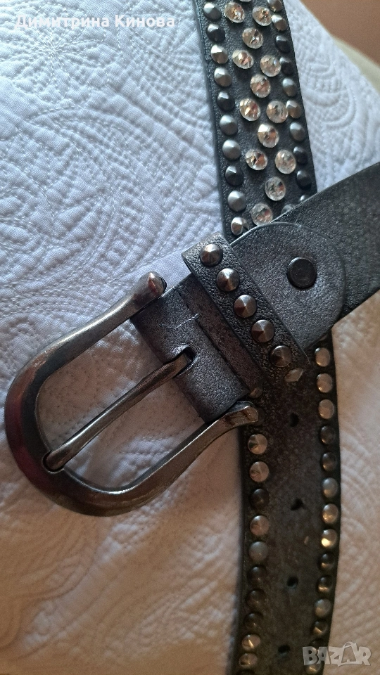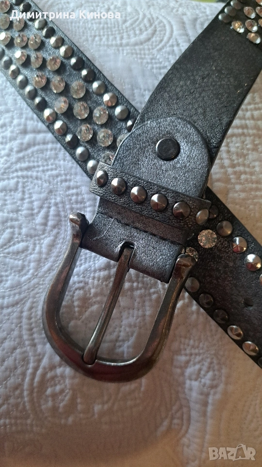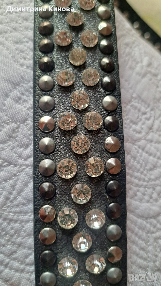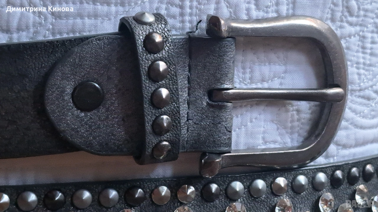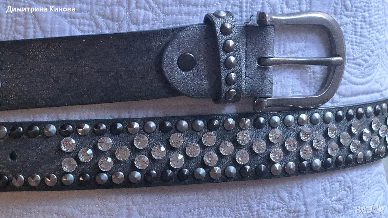 Дамски колан от естествена кожа декорирана ссиви и черни капси и бели камъни ,колана е сребрист ,