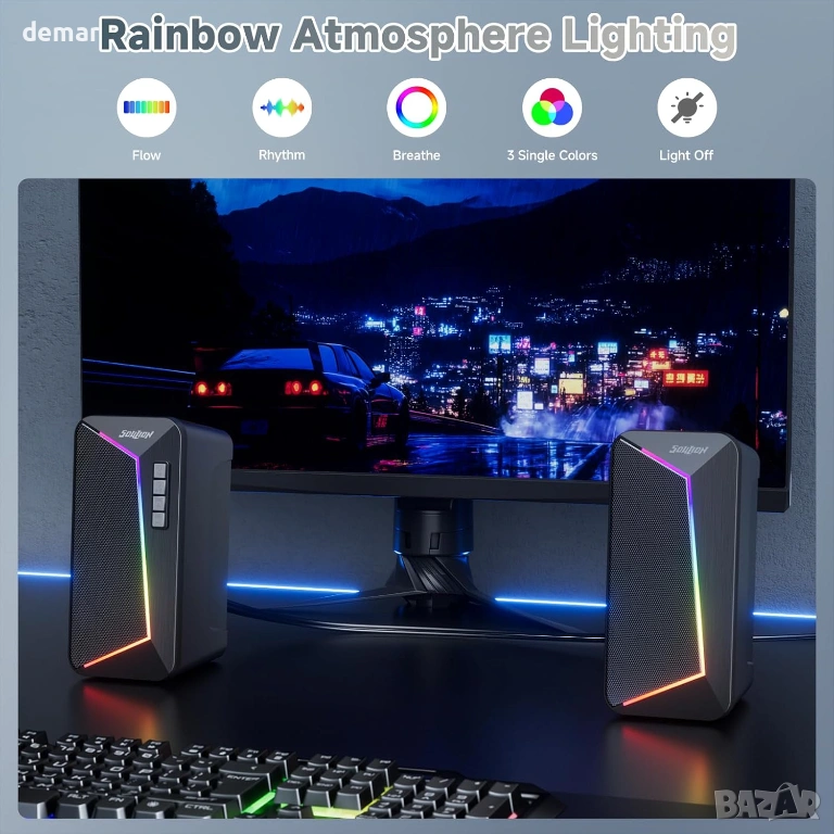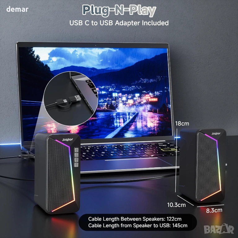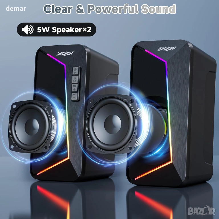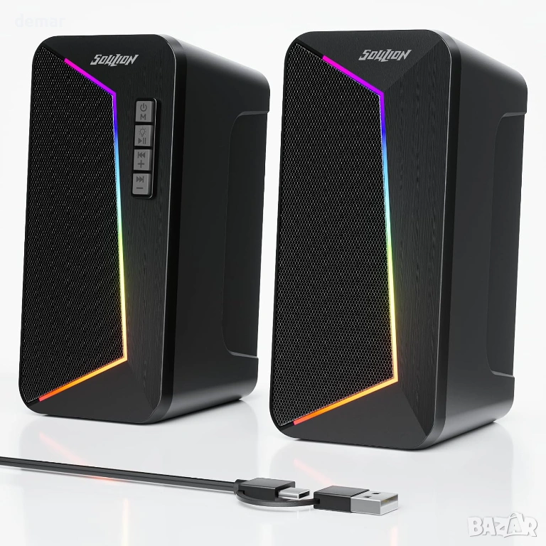 SOULION компютърни високоговорители, USB C/USB захранвани, цветна LED светлина, стерео 2.0
