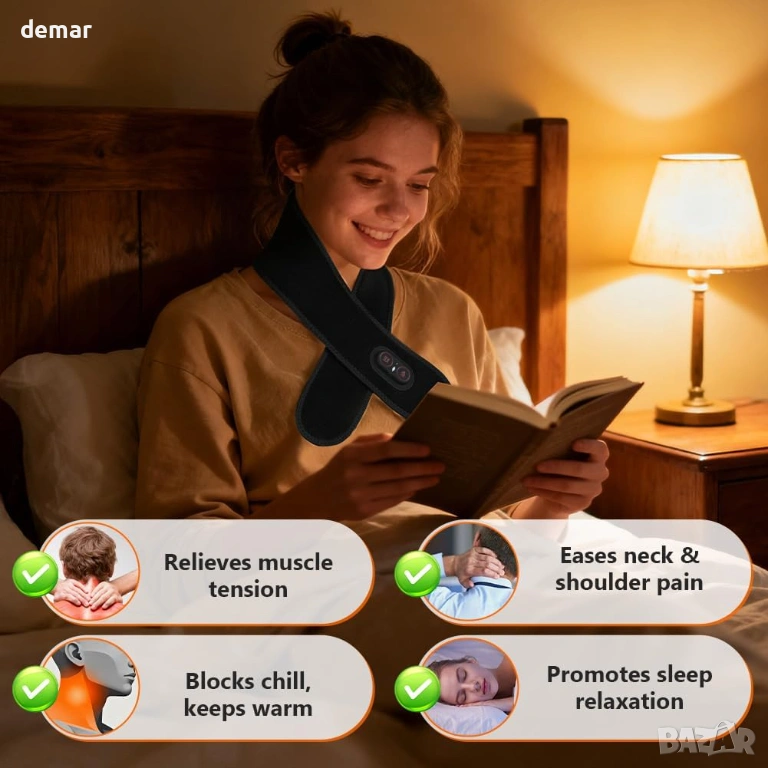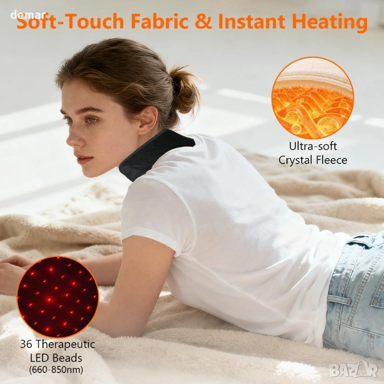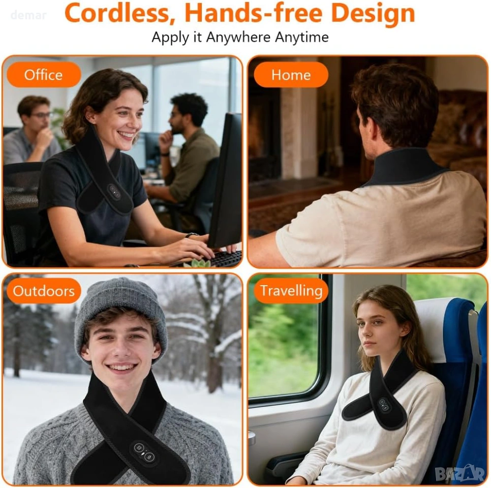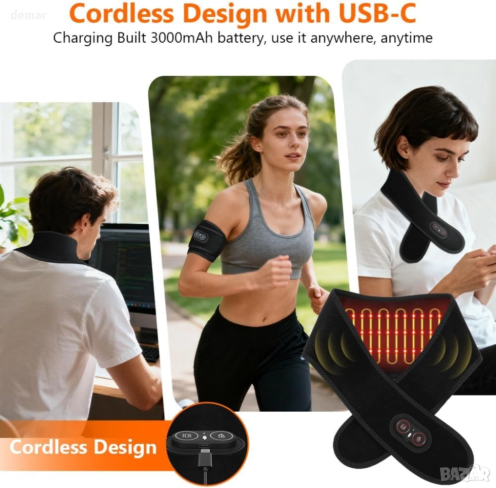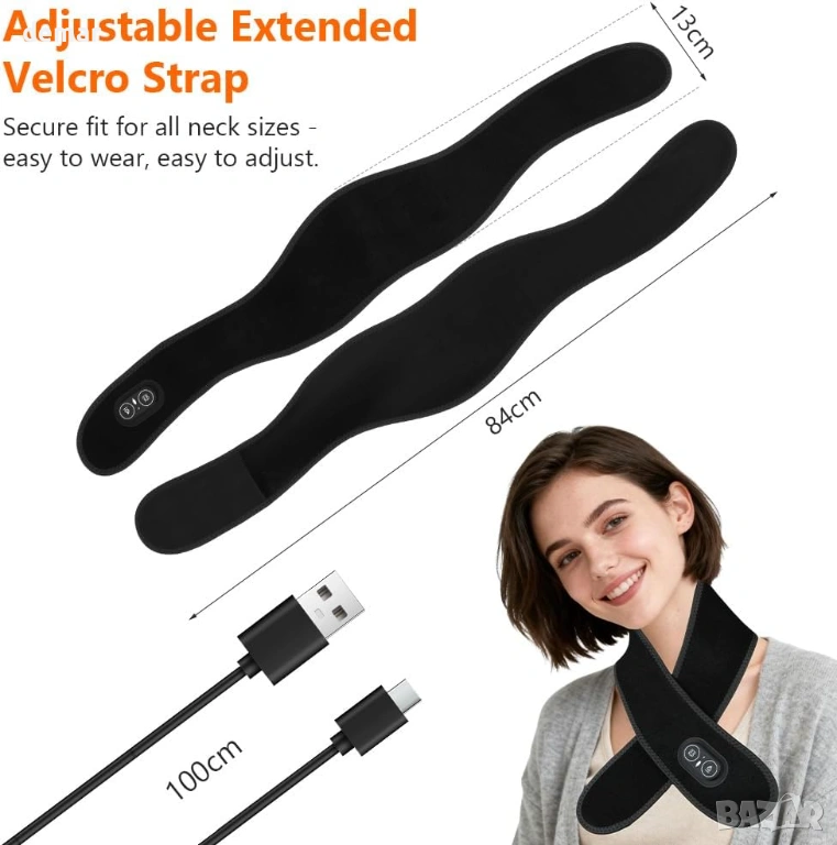 Този отопляем шал е изработен от ултра мека, дишаща и щадяща кожата материя, проектирана за целодневен комфорт, с леко и сигурно прилягане, което остава на мястото си без обем. Той съчетава регулируемо нагряване (три температурни нива) с вградена функция за вибрационен масаж, която помага за облекчаване на мускулното напрежение, намаляване на сковаността и подобряване на кръвообращението. Захранван от акумулаторна батерия с капацитет 3000 mAh, той предлага над два часа безжична употреба с едно зареждане, което го прави удобен за употреба навсякъде. Универсалният му дизайн позволява да се използва върху множество области на тялото, включително врата, ръцете, краката и ставите, осигурявайки целенасочена топлина и релаксация, като същевременно остава практичен и удобен за ежедневна употреба.