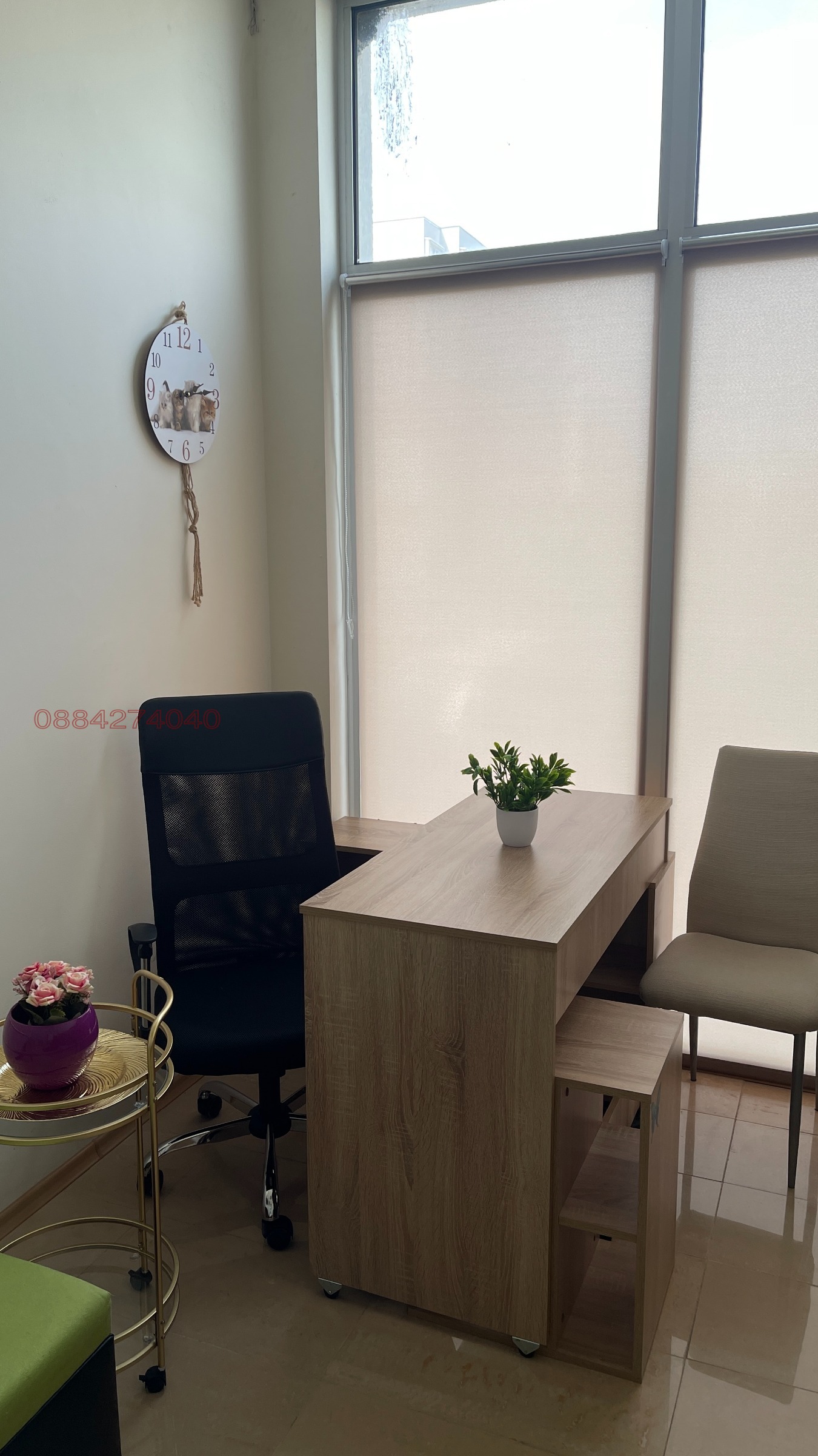 Отдава се под наем чисто ново поддържано, подходящо обзаведено офис помещение, което може да се трансформира според нуждите на ползвателя /т.е да се довнесат, намалят или разместят елементи от оборудването/. Подът е с гранитогрес, стените са боядисани в слонова кост и ново обзавеждане. Намира се на първи надпартерен етаж с изглед към централната улица на реда на която се намира поща и други работещи вече магазини. Много светло помещение с френски прозорци и със светли щори. Захранено с ток. Тихо, спокойно място с приятен изглед. На гърба на сградата има магазин Фантастико, в близост Била, сладкарница Марти, предстояща спирка на метро/в момента се пуска в действие/, шоурум на фирма Сузуки, Домко. Урбанизиран и съвременно организиран квартал /нови блокове и сгради, проектиране на нови/, HomeMax, близост бул. Владимир Вазов, Герена, маг. Зора и търговските центрове и хранителни магазини около Jumbo на Ботеградско шосе, пътят за излизане от София. Паркирането е свободно, което е много ключов момент за предвижването и спокойствието на хората в района. Към помещението има санитарен възел.