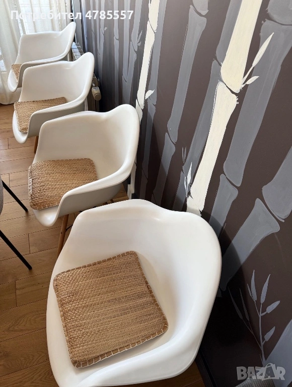 Четири използвани бели столове от колекцията Eames, с дървени крака и плетена седалка. Подходящи за домашен или офис интериор, в добро състояние.