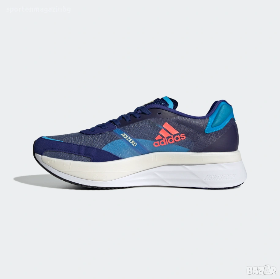 Дишаща горна част с вътрешна опора изработена от лека, мрежеста част за добра опора и естествена гъвкавост, която осигурява перфектно дишане по време на движение а синтетичните панели на повърхността увеличават здравината на маратонките. Пълно дантелено затваряне с подплатен език и яка. Нисък профил за по-голяма свобода при движение. Допълнително подсилени в областта на петата и предната част за сигурност и стабилност. Лого Adidas върху езика, от вътрешната страна и отличителни три ленти от външната страна. Вътрешната текстилна част заедно със стелката осигуряват невероятна мекота и комфорт с всяка крачка. Омекотяването Lightstrike Pro+ и Lightstrike EVA, комбинирано с пружиниращата междинна подметка, осигуряват възвръщане на енергията за вашето оптимално изживяване при бягане. Аdidas Lightstrike Pro осигурява супер леко омекотяване, плюс връщане на енергия за следващо ниво на скорост. ENERGYRODS с въглерод и допълнителните ENERGY BLADES осигуряват лека твърдост и ограничават загубата на енергия при пръстите. Continental™ - каучукова външна подметка за изключително сцепление дори при мокри условия. Adizero е настроен за скорост, позволявайки на спортистите да преодолеят дори невъзможното.