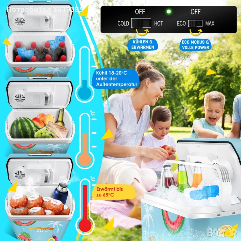 С функцията за охлаждане можете да охладите напитките или храната си до 18 градуса по Целзий под околната температура. Охладителната чанта е оборудвана с две различни нива на мощност: MAX и ECO.