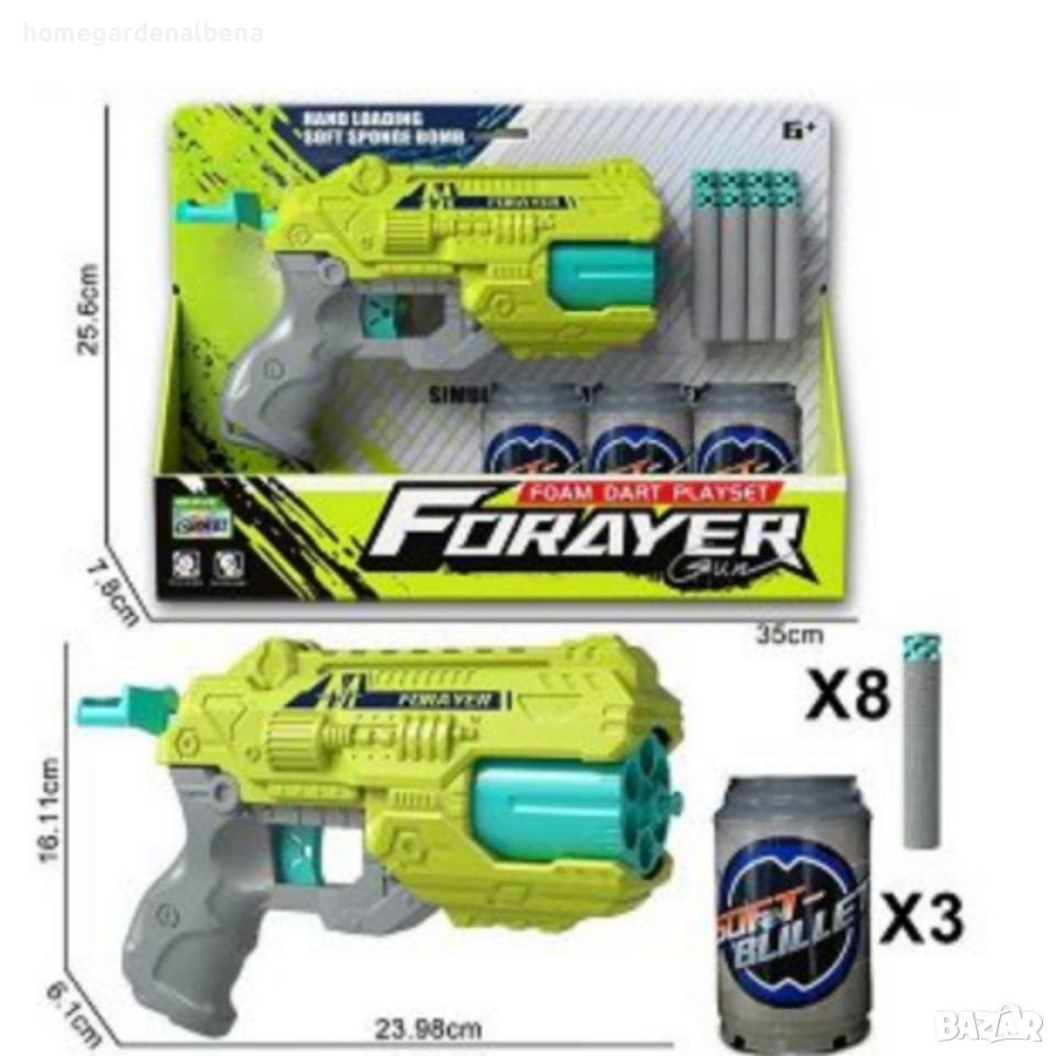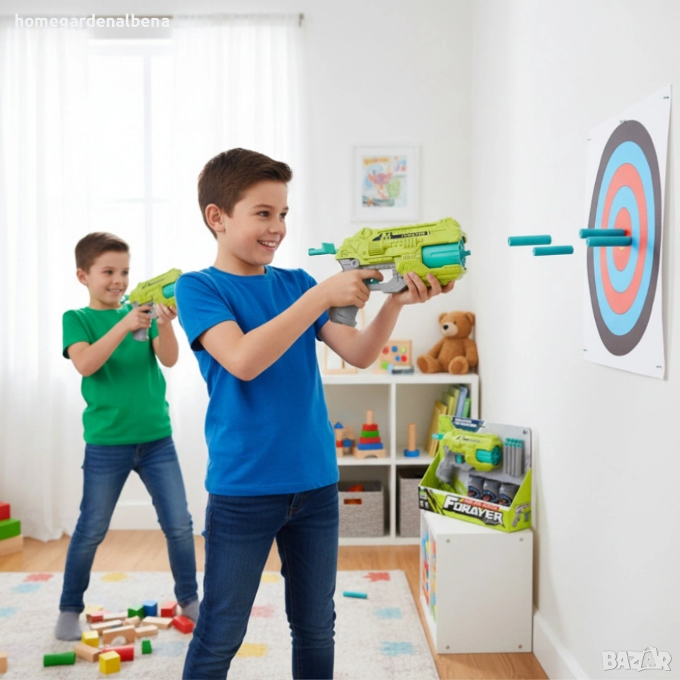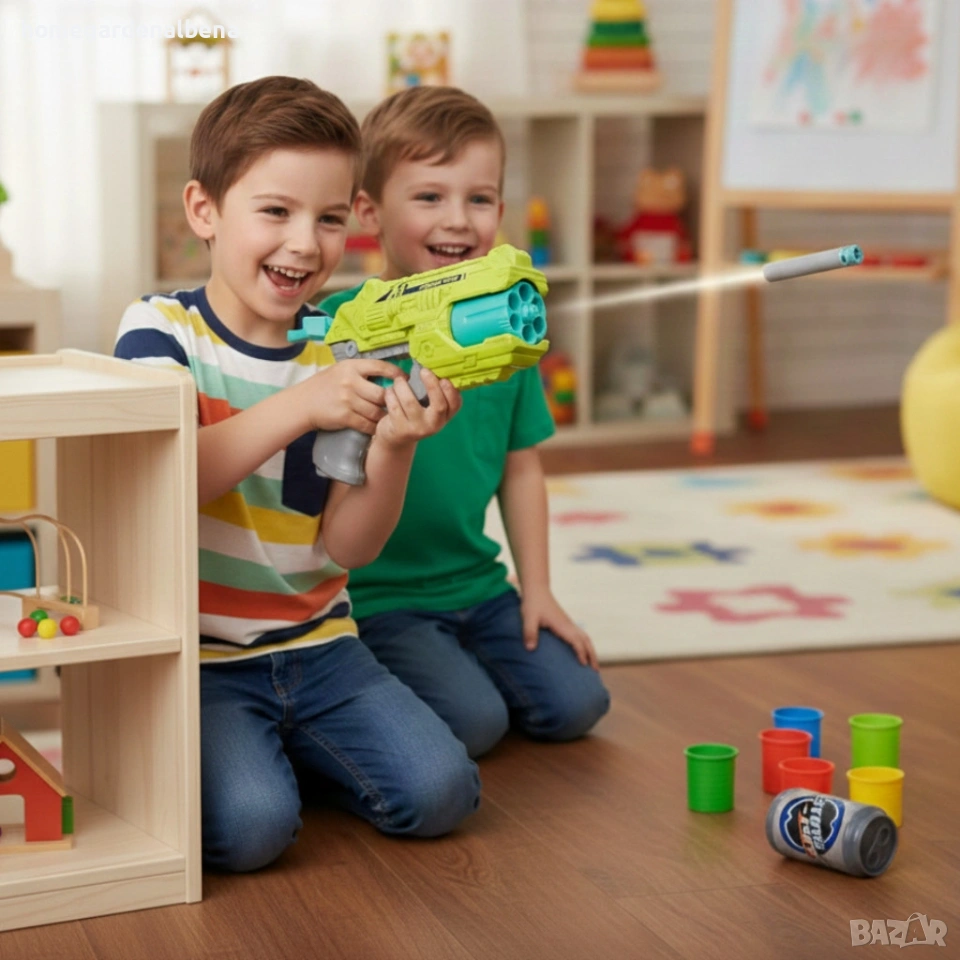 Home & Garden by Albena представя забавен пистолет с меки куршуми и мишени – идеалният подарък за активни деца, които обичат динамична и вълнуваща игра. Комплектът включва всичко необходимо за незабавно забавление – пистолет, 8 меки патрона и 3 мишени тип кенчета.