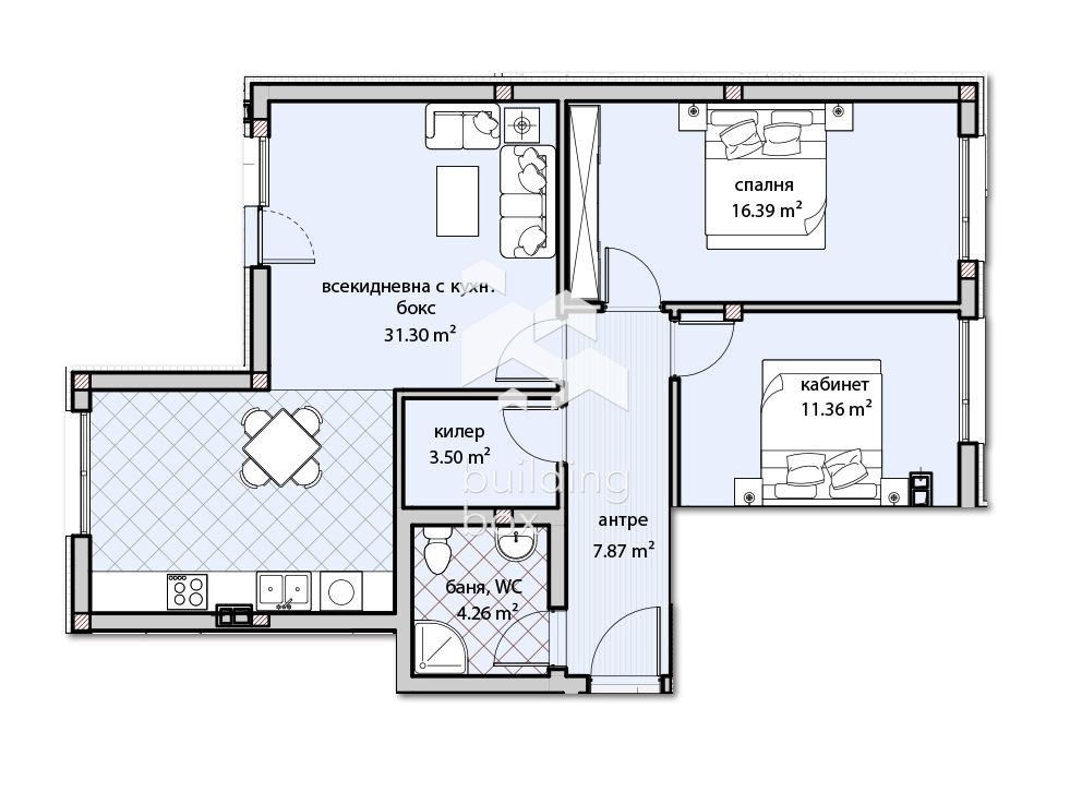 РАЗПРЕДЕЛЕНИЕ: Всекидневна с кухненски бокс - 31,30 кв.м., спалня - 16.39 кв.м., втора спалня - 11.36 кв.м., баня с тоалетна - 4,26 кв.м., килер - 3.50 кв.м., входно антре - 7,87 кв.м. Чистата застроена площ на апартамента е 91,97 кв.м.